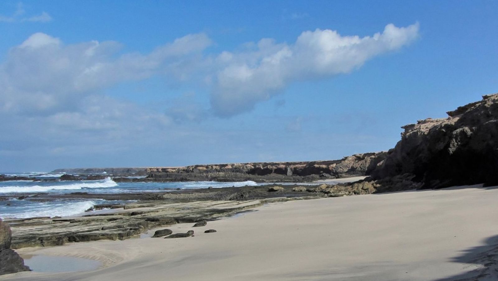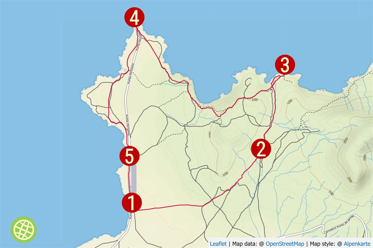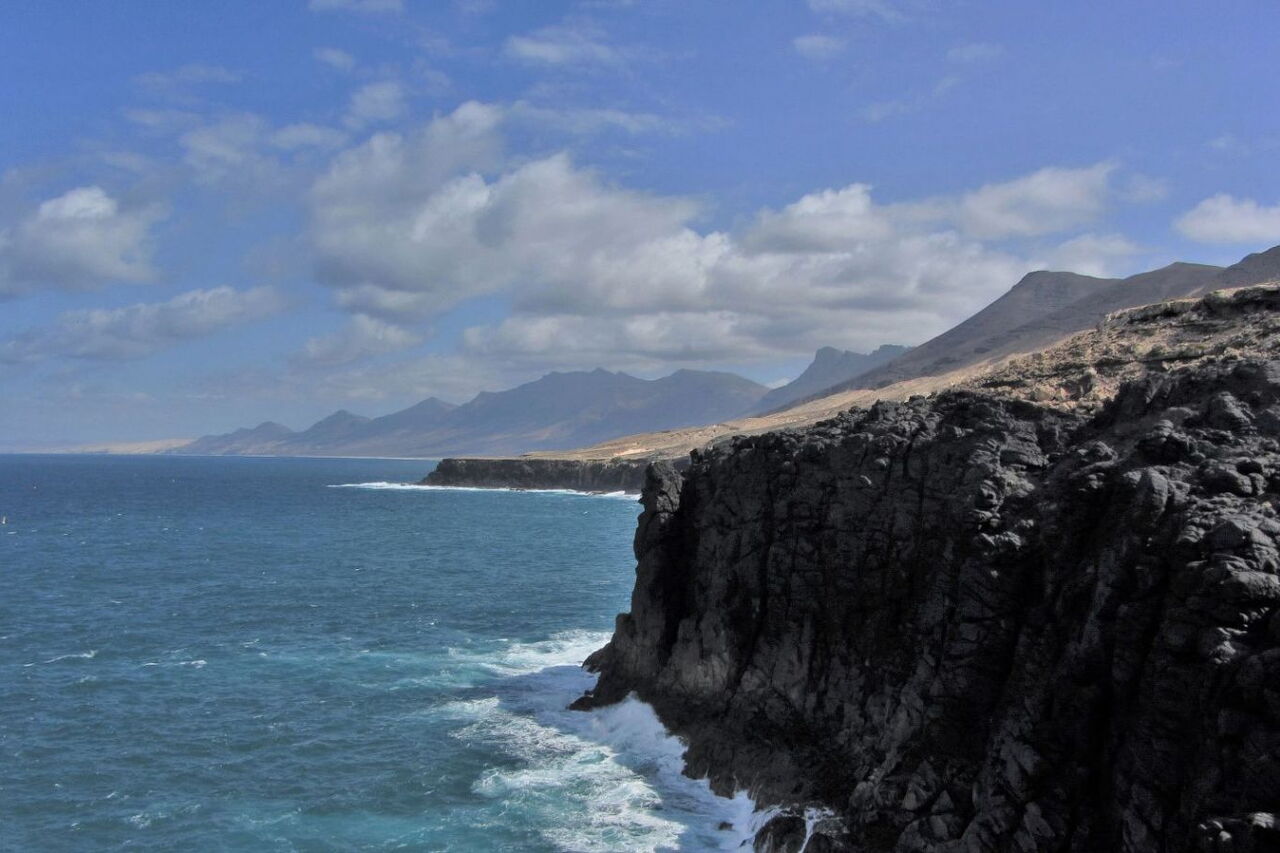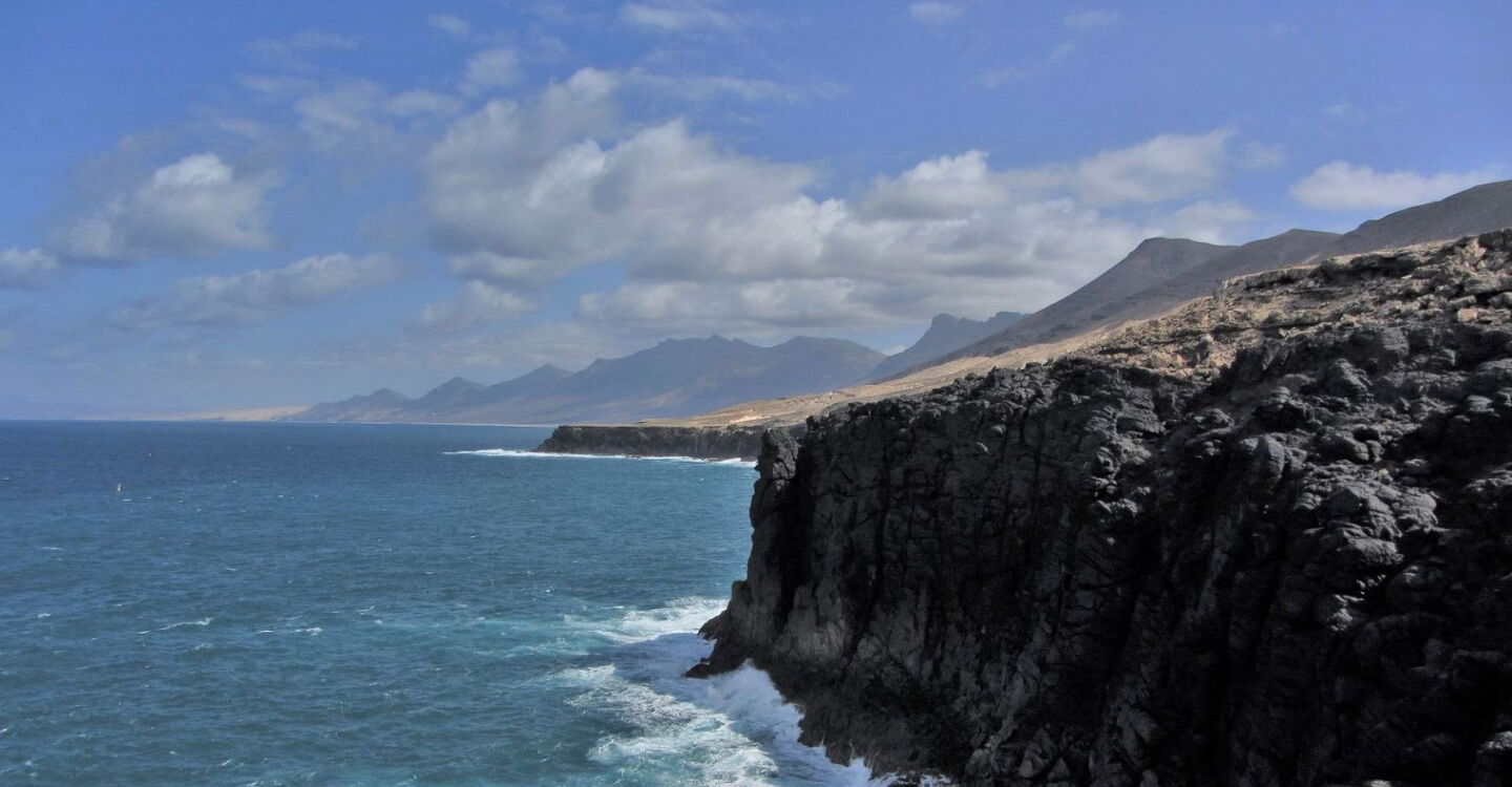 Geht man weitere 300 m nach rechts, so erreicht man einen wunderschönen (03) Aussichtspunkt (49 m). Schwarze Vulkansteinklippen treffen hier auf den azurblauen Atlantischen Ozean. Bei klarem Wetter hat man von hier aus eine beeindruckende Sicht auf die Strände Playa de Cofete und Playa de Barlovento sowie entlang der Bergkette der Halbinsel Jandia.