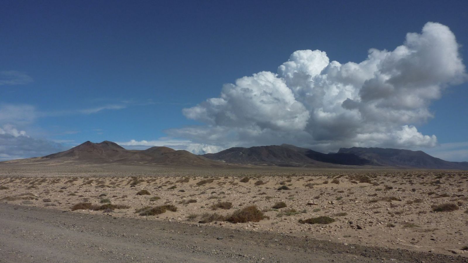 Vom (01) Start und Ziel (18,4 m) oberhalb des Playa de Ojos wandern wir im rechten Winkel zur Schotterpiste – also in östliche Richtung – weglos in Richtung der Ausläufer des halb links vor uns liegenden und zugleich südlichsten Vulkans von Fuerteventura – Montana Las Talahijas. Über der kargen Ebene weht meistens ein starker Nordostpassat. Wir treffen auf eine Schotterpiste, die wir nach nur 200 m wieder verlassen, um nun um den Vulkan herumzulaufen und so in eine Ebene zwischen zwei Vulkanen zu gelangen.