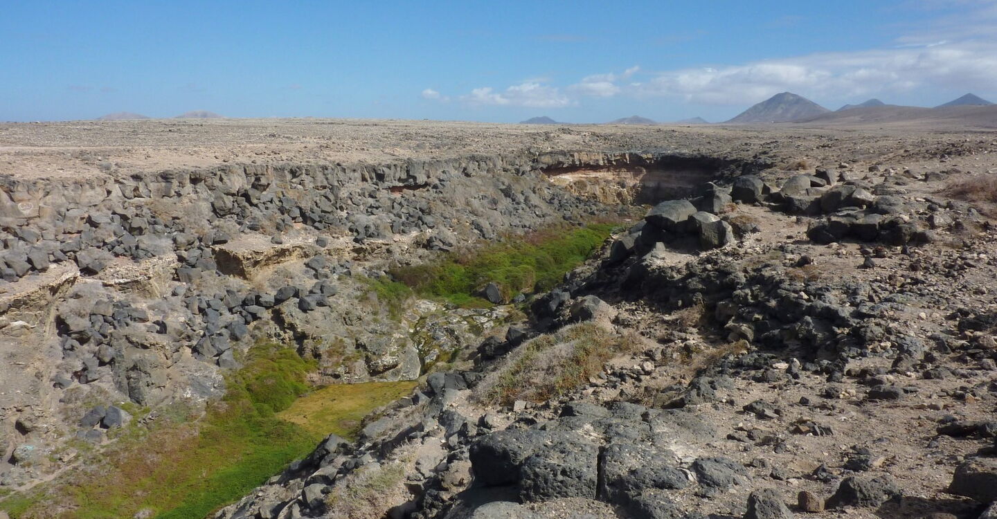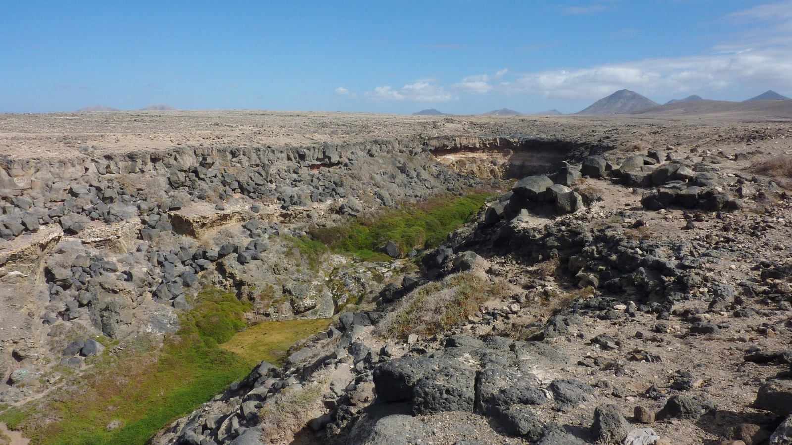 Wir blicken in ein Barranco, das selbst am Ende der monatelangen Trockenzeit noch ein wenig Wasser führt. Mittig von dieser kleinen Schlucht führt ein Pfad direkt zum Strand.
