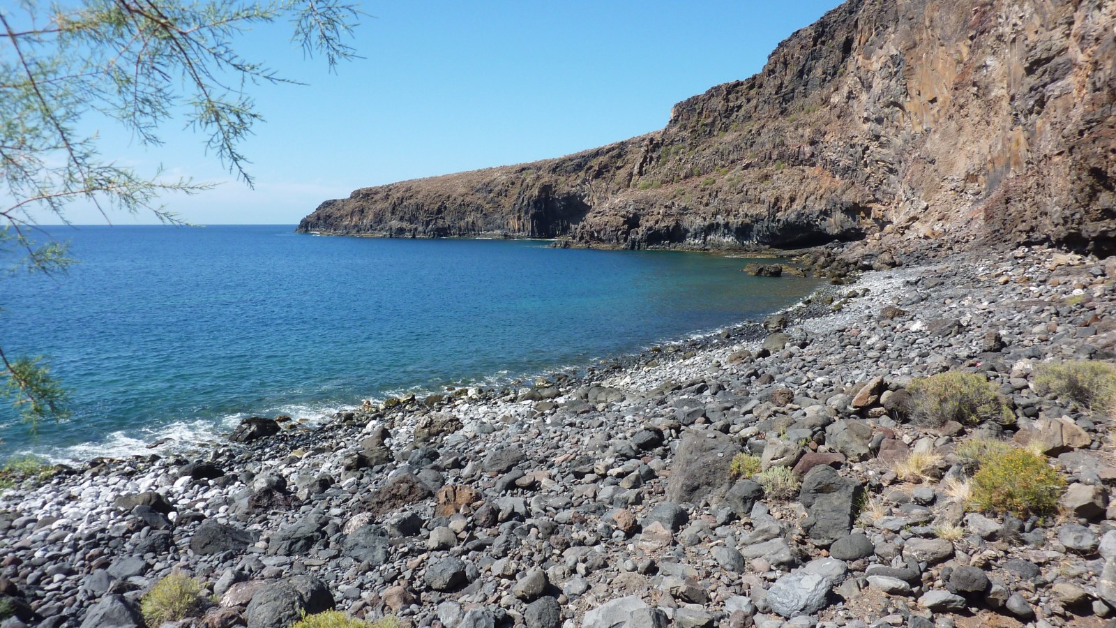 Es wird ein kleines Barranco gequert, bis wir ca. 100 Höhenmeter über dem (02) Playa de Suarez (21 m) stehen. Steinmännchen markieren den Abstieg in die Bucht. Immer wieder muss auf rutschigem Untergrund der Hang gequert werden, weil der ursprüngliche Weg abgerutscht ist. Wir gehen weiter, bis wir die 130 Meter breite Bucht erreicht haben. Leider gibt es hier keine sandigen Stellen und die großen Kieselsteine laden nicht zum Verweilen ein. Taleinwärts, hinter der Steinplattform mit dem grünen Teppichrasen, steigen wir halb rechts im Hang auf und folgen dabei Steinmännchen, bis wir vor einer ca. 5 m hohen Felswand stehen. Links neben einer kleinen Höhle befindet sich der Aufstieg - Kletterstelle mit dem Schwierigkeitsgrad zwei - zu einem Steinmännchen hinauf.