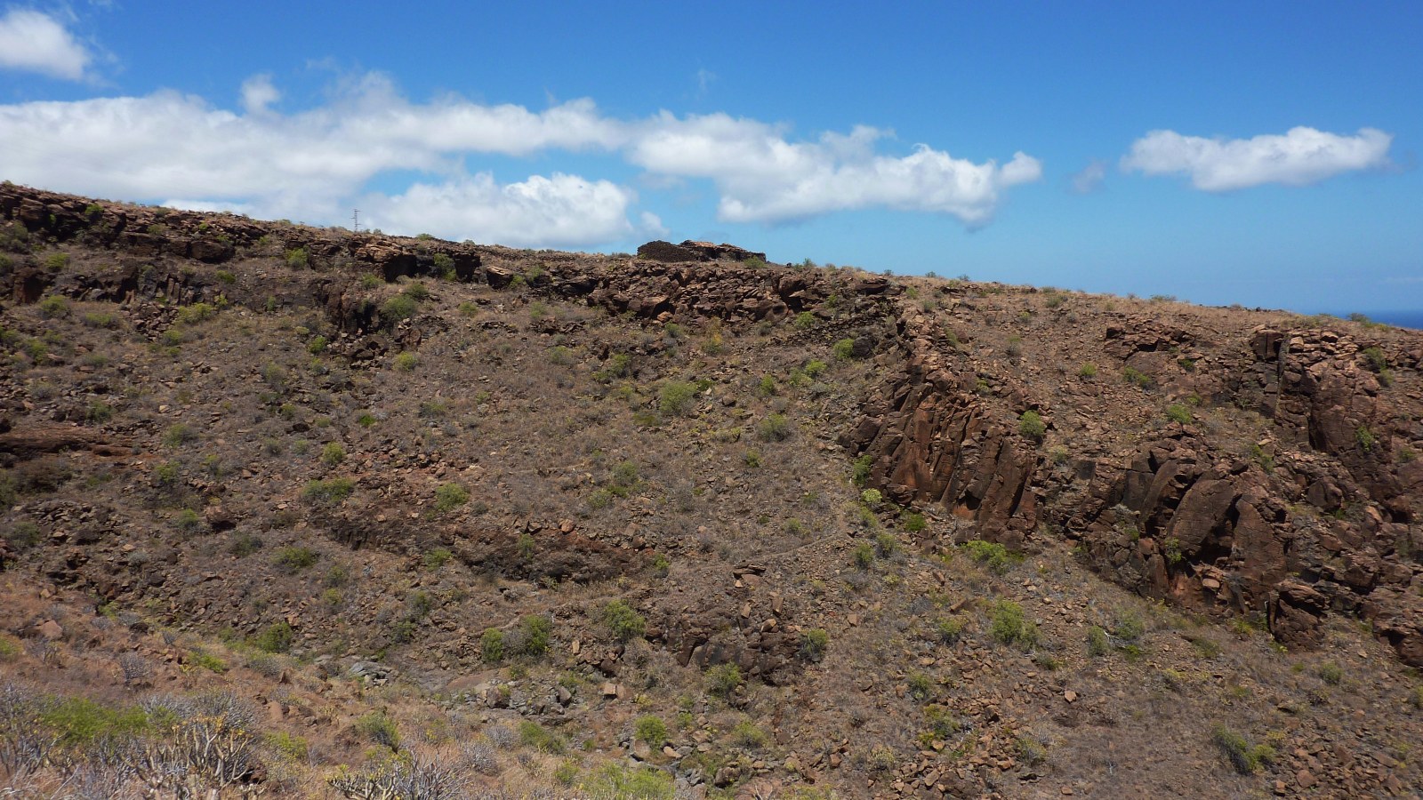 Am (01) Playa del Medio (5 m) verlässt am linken hinteren Ende des Parkplatzes ein steil aufsteigender Pfad die Bucht in östliche Richtung. Wir überschreiten die Punta del Joradillo und nach einem kurzen Abstieg erreichen wir den Playa de Chiriguarime. An seinem westlichen Ende gibt es einige sandige Stellen. Wir queren den Strand zu seinem östlichen Ende und gehen direkt auf eine kleine Ruine zu. Hinter dieser beginnt ein steil aufsteigender Pfad, der durch vereinzelte hellblaue Punkte markiert wurde. Auf dem Bergrücken angekommen, wandern wir kurzfristig auf dem oberen von zwei Küstenpfaden, orientieren uns dann aber im weiteren Verlauf an Steinmännchen.