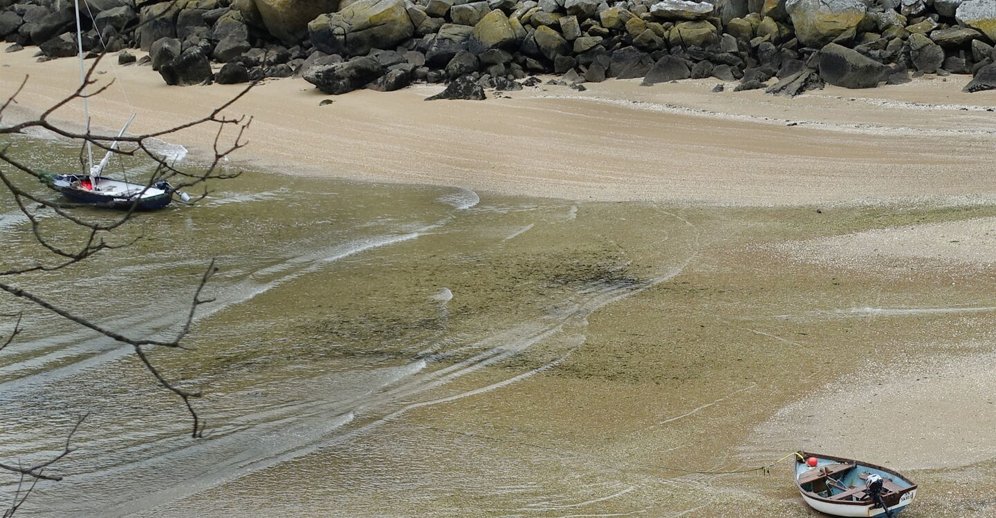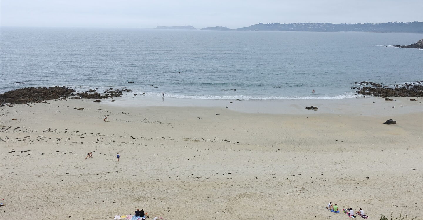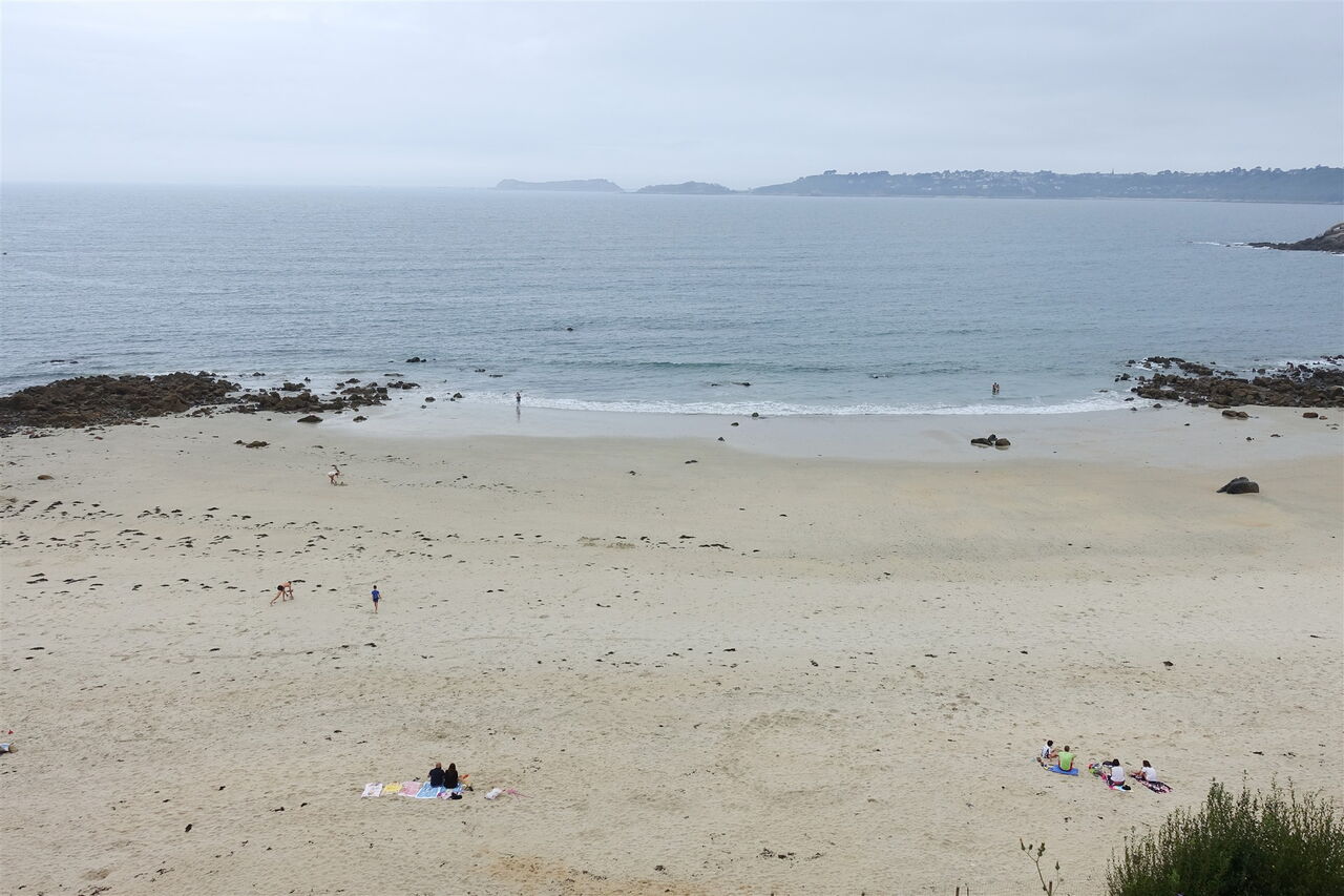 Wir gehen ein kurzes Stück auf der schmalen Straße links bergauf, prachtvolle und farbenfrohe Anwesen schmiegen sich in den steilen Hang. Bei einem weißen Haus zweigen wir halb rechts auf die Piste ab. Es folgt ein Wegabschnitt mit einer tollen Aussicht, man schaut über die Bucht Bai de la Vierge bis auf das offene Meer. Kurz später entfernt sich der Pfad von der Küste, nach einem steilen Abstieg und hinter einer Hauszufahrt kann man rechts zu einem Strand heruntergehen. Sonst gehen wir geradeaus und bergauf an einer mit Efeu überwucherten Mauer entlang. Hinter einem grünen Einfahrtstor halten wir uns halb rechts, passieren ein Metalltor und erreichen die wunderschön gelegene Bucht des 03 Plage de Saint-Quiriou (18 m).