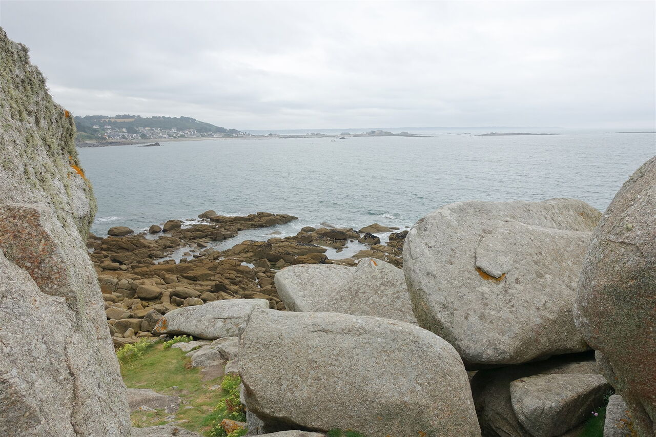 Links oberhalb des Strandes befindet sich der weiterführende Pfad, exotisch anmutende Eukalyptusbäume säumen den Weg. Wir erreichen die 04 Pointe du Dourven (14 m). An dieser Stelle befand sich einst ein Wachposten, das verbliebene Wachhaus aus dem 18. Jahrhundert erinnert an die militärische Vergangenheit. Von diesem besonderen Aussichtspunkt blickt man Richtung Osten auf die Mündung des Flusses Léguer und die Strände von Beg Léguer, Richtung Norden in den Ärmelkanal und nach Westen über gewaltige Felsen bis zur Landzunge Pointe de Séhar und zum Plage de Notigou – unser nächster Wegpunkt.