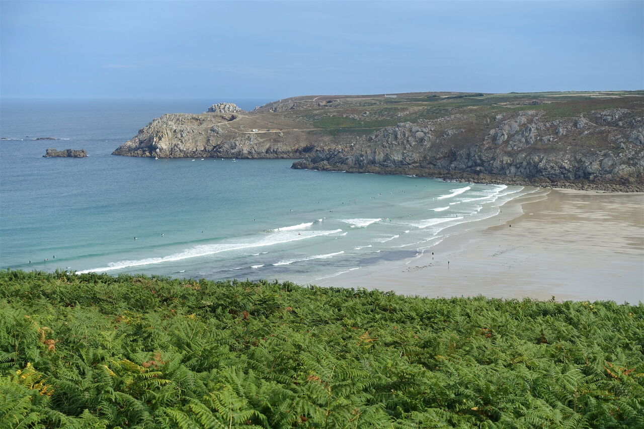 Am Start und Ziel am Parkplatz gehen wir links vom Restaurant in Richtung Meer und 01 Baie des Trépassés (11 m). Kurz vor dem Ufer gehen wir links auf einem Pfad auf einen Bunker zu, um dort über Treppen auf die Klippen zu gelangen. Bei einer ersten Weggabelung gehen wir noch oberhalb des Strandabschnitts weiter. An der nachfolgenden Stelle, wo sich ein Zaun befindet, zweigt nach links ein schmaler Pfad durch Farne ab. Hinter einer Steinmauer ignorieren wir den rechten Abzweiger und gehen weiter auf die Anhöhe zu. Ein weiterer rechter Abzweiger wird ignoriert. Bei einer Kreuzung mehrerer Wege gehen wir links an einem hellblauen Tor vorbei, um nach 10 m rechts den Weg durch die Farne zu nehmen und in Richtung der dahinter liegenden Häuser zu gehen.