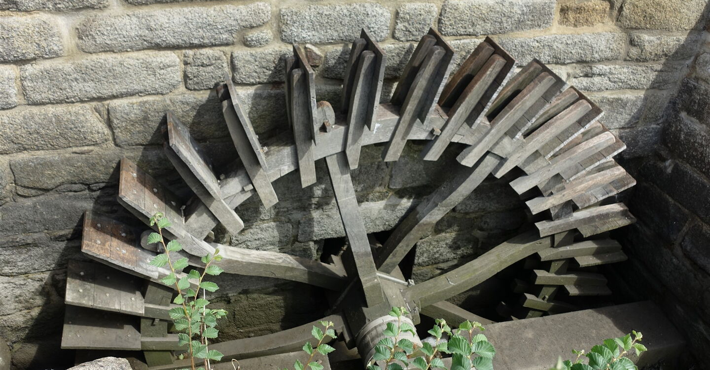 Wir queren die Straße und gehen auf dem parallel verlaufenden Pfad weiter, kurz später dann auf der Straße. Bald erreichen wir die Gezeitenmühle 02 Moulin A Mer Hénan (7 m). Hinter dem ehemaligen Haus des Müllers biegen wir links ab, gehen über den Parkplatz und gelangen hinter der Informationstafel wieder an das Flussufer. Bei zwei hölzernen Wegweisern führt rechts ein Weg zu der versteckt im Wald liegenden Chapelle Sainte-Marguerite, die wie viele bretonische Sakralbauten aus Granit besteht.