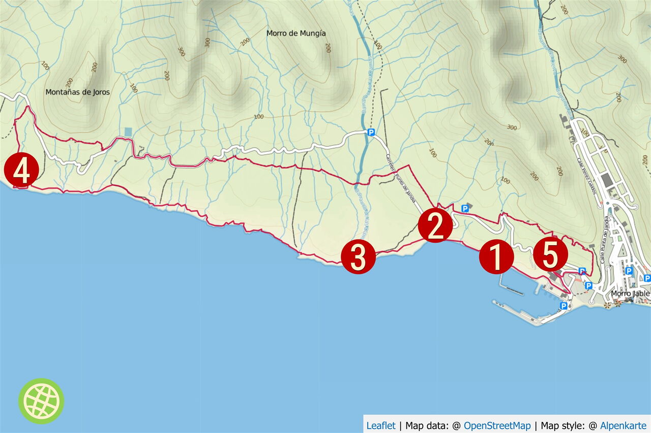 Vom (01) Start und Ziel (1 m) erfolgt zunächst ein Strandspaziergang am 600 m langen und wunderschönen Playa de Colorades, bis eine Felswand das Weiterkommen versperrt. Hinweis: Bei sehr starkem Ostwind oder starkem Wellengang verbleibt nur ein sehr schmaler Strandstreifen.