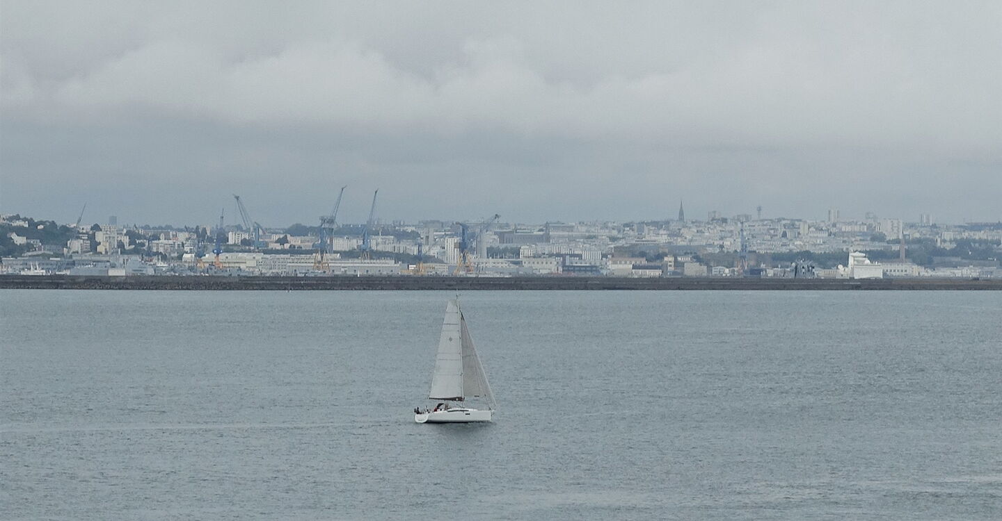 Wir setzen unsere Wanderung fort. Bei der nachfolgenden Weggabelung gehen wir halb links durch den Verteidigungswall hindurch und im weiteren Verlauf bewegen wir uns mittig zwischen zwei Verteidigungslinien. Kurz darauf gehen wir links und sofort wieder rechts. Bei einer Kreuzung mehrerer Pfade gehen wir geradeaus weiter. Es folgt ein zugewachsener Pfad, Brennnesseln erschweren das Vorankommen. Wir gehen unter einer kleinen Brücke hindurch und am Parkplatz links, um hinter einem kleinen Bunkerhaus über den Treppenpfad zum 03 Fort de Cornouaille (22 m) abzusteigen – eine Artillerie-Verteidigungslinie aus den 17. Jahrhundert, die den Seezugang nach Brest kontrollierte. Ihre Position wurde bewusst so gewählt, dass sie einfahrende Schiffe einem gewaltigen Kreuzfeuer aussetzen konnte. Bei einem riesigen betonierten Rechteck – keine Ahnung, was das sein soll, hier befindet sich auch ein Aussichtspunkt – gehen wir rechts. Wir kommen an der unterhalb am Ufer liegenden Torpedobatterie vorbei und können bereits den Hafen von Brest auf der anderen Uferseite ausmachen.