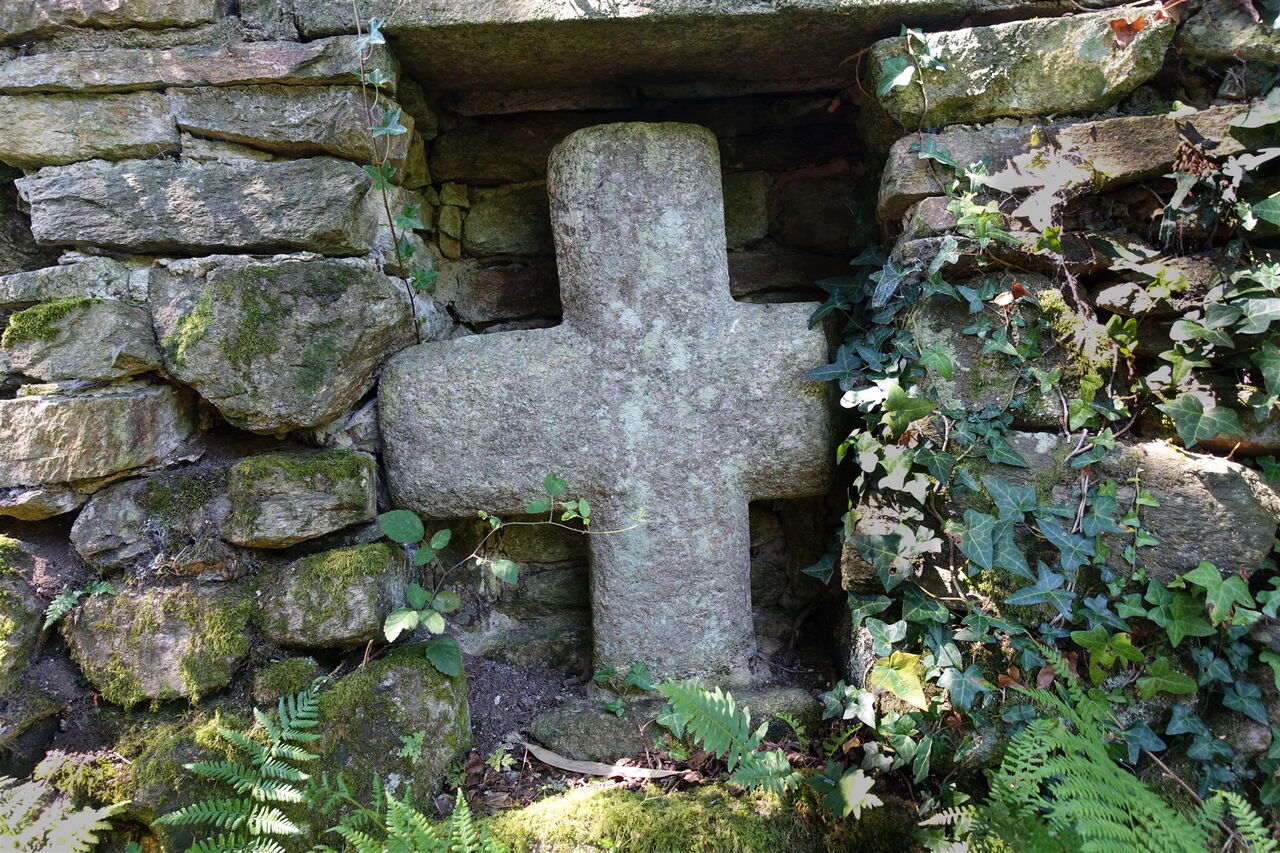 Nachdem wir durch eine Linkskurve gegangen sind, erreichen wir die ehemalige Mühle von Lesnevé, sie beherbergt heute Ferienwohnungen. Direkt hinter deren Parkplatz verlässt ein Pfad die Straße nach links. Dieser führt entlang der langen Mauer des Château de Beauregard Saint-Avé, das man von keiner Position aus sehen kann. Es wurde im 18. und 19. Jahrhundert erbaut, an der Stelle, wo zuvor ein altes Herrenhaus aus dem 15. Jahrhundert stand. Historisch ist das Gebäude interessant, denn am 14. Februar 1800 war es Ort der Unterzeichnung der Friedensverträge der Bretagne. Nach einem wunderschönen Hohlweg gelangen wir an eine Weggabelung, an der wir halb rechts gehen, bevor wir kurz später wieder auf die Straße treffen, an der wir links gehen. Die Straße endet an der Hauptstraße, an der wir rechts auf dem Pfad 333 m weitergehen, um hinter einem Holztor die Straße zu queren und auf einen weiteren schönen Hohlweg zu gelangen. Wir erreichen die Quelle beim 04 Croix de Fontenon (67 m).