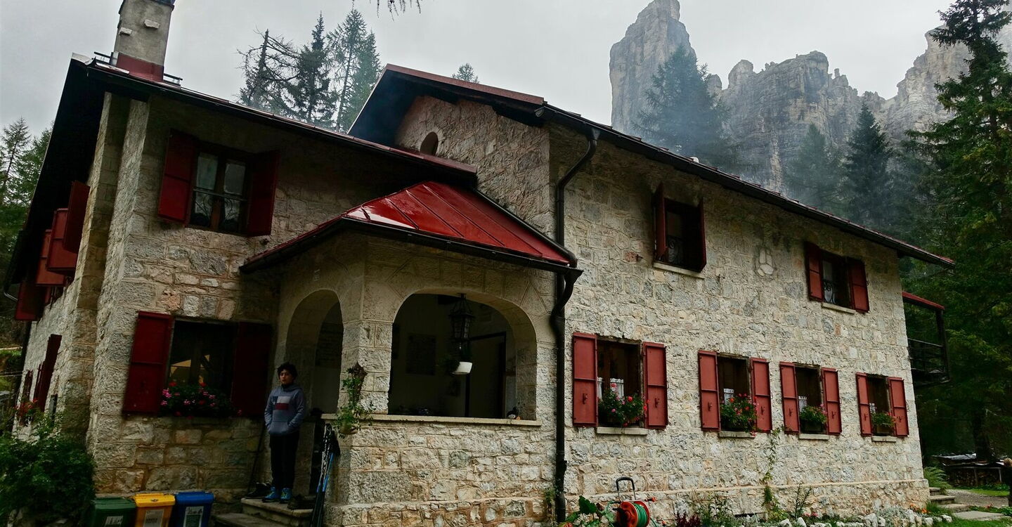 Wir verlassen das 01 Rifugio Vazzolèr (1.714 m) in nordöstlicher Richtung auf der Schotterpiste. Der Wanderweg 555/560 Richtung Rifugio Capanna Trieste macht nach ca. 400 m eine scharfe Rechtskurve. Nun wandern wir Richtung Osten, durch die südlichen Ausläufer des Tales Val dei Cantoni und entlang der imposanten Südwestwand des 2.485 m hohen Torre Trieste.