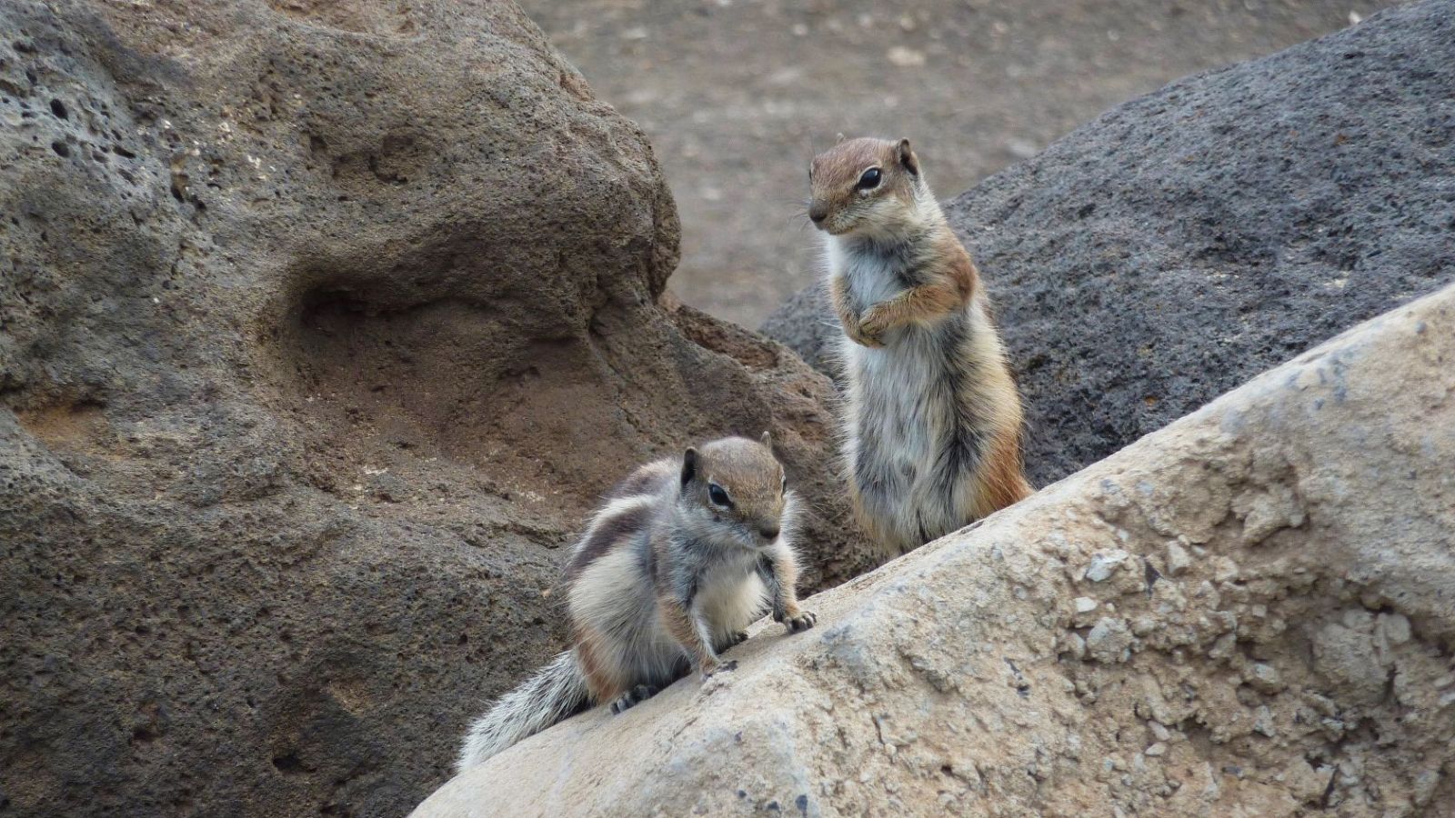 Nachdem wir das über uns liegende Hotel Club Paraiso Playa hinter uns gelassen haben, erreichen wir das Barranco Esquinzo. An diesem Wegpunkt bitte unbedingt ein wenig ins Barranco – bis zum Parkplatz – vorgehen, wo sich viele fast zahme Atlashörnchen angesiedelt haben. Das (03) Atlashörnchen (16 m) kam vor etwa 25 Jahren auf dem Schiffsweg nach Fuerteventura. Da es dort sehr ähnliche Lebensverhältnisse wie in Marokko vorfand, haben sich die anfangs lustigen Nager schnell zur Plage entwickelt.