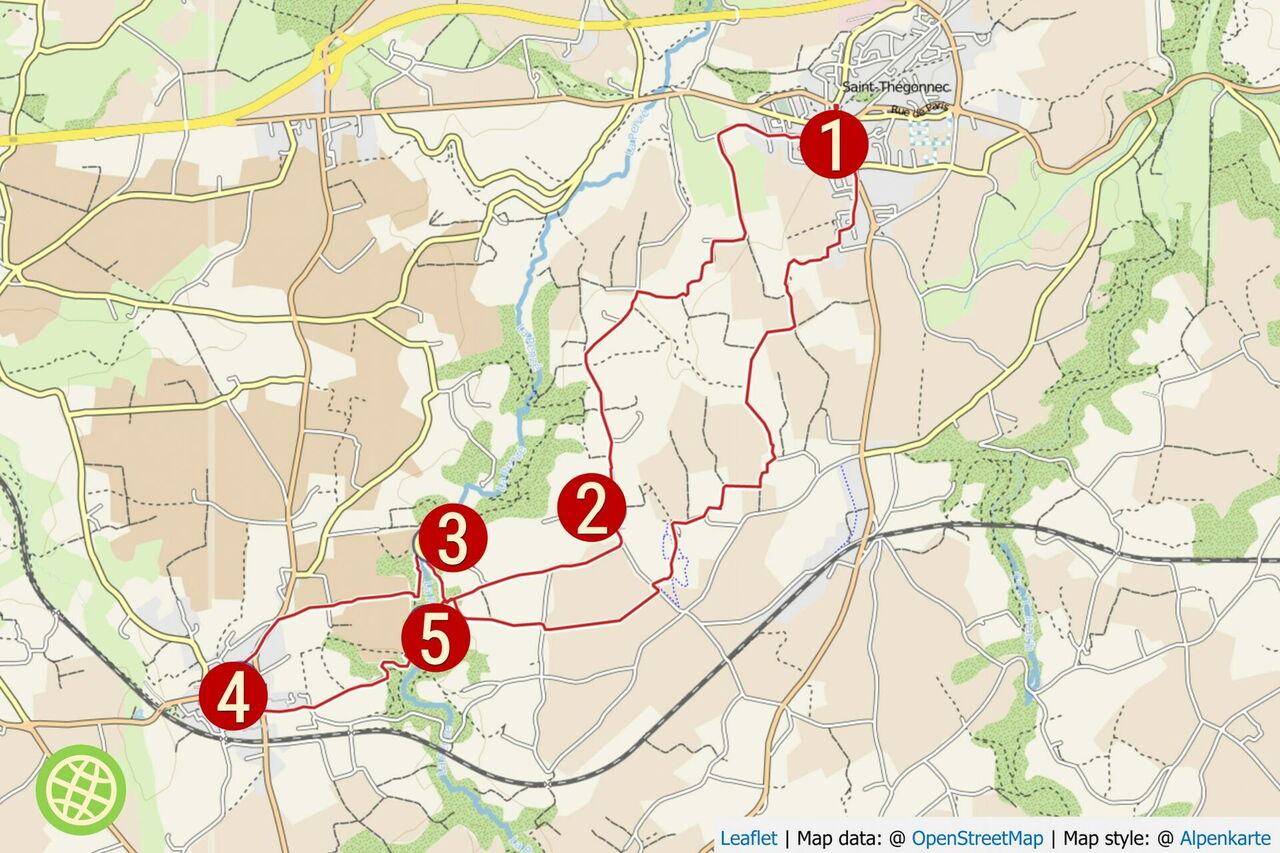 Mittelschwere Wanderung aufgrund der Länge und des erhöhten Navigationsaufwands. Art des Weges: 10 % Pfad, 30 % Piste und 60 % Straße. Zusatzausrüstung: Keine. Einkehr: Crêperie Steredenn im Ortskern von St-Thégonnec bei km 16,15 und die Crêperie Ar Chupen in Guimiliau bei km 8,15. Beste Wanderzeit: Ganzjährig. Sehenswert Region: der 10 km entfernte umfriedete Pfarrbezirk Enclos Paroissial de Lampaul Guimillau, Geokoordinaten 48.493130 -4.040579.