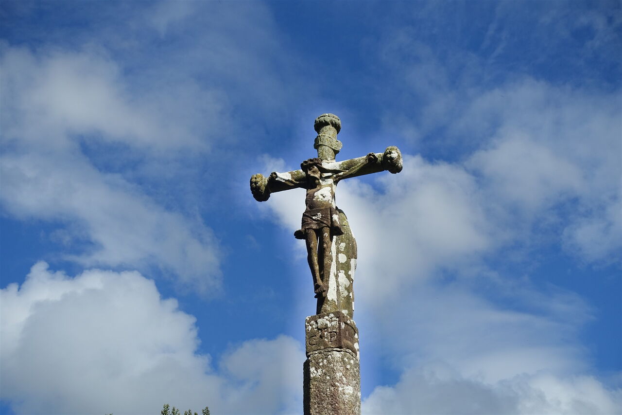 Mit der Kirche im Rücken biegen wir rechts in die Rue de Chapellendy ein und gehen bis zu einem großen Steinkreuz vor, um dort links abzubiegen. Bei einem weiteren Steinkreuz gehen wir durch die Rechtskurve der Straße und dann durch die Linkskurve in Richtung der Ortschaft Bouges. Hinter dem letzten Haus der Streusiedlung geht es auf einem Wirtschaftsweg weiter. Bei der nächsten Weggabelung gehen wir halb rechts in den Wald herunter. An der darauffolgenden Straße gehen wir links und kommen an einem ersten Kreuz vorbei, um dann bei der nächsten Möglichkeit, hinter dem zweiten 02 Steinkreuz (118 m), rechts abzuzweigen – auch ausgeschildert nach Kerever. Am Ende der Straße, inzwischen sind wir durch drei kleine Streusiedlungen gegangen, gehen wir um das Steinhaus mit den hellblauen Fensterläden herum, um dann bei der ersten Weggabelung rechts im Wald bergab zu gehen.