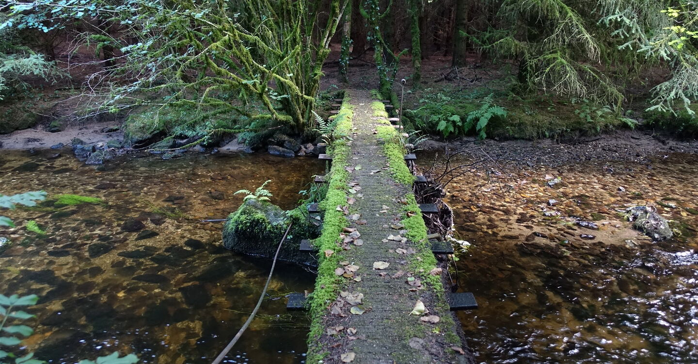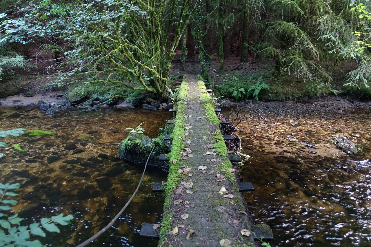 In Kürze: Der Weg wird zum Pfad; wir queren eine Piste; wir queren über die Holzbrücke den 03 Bachlauf (65 m) und gehen danach links; es folgt ein romantischer Wegabschnitt durch den Wald; in einem dicht bewachsenen Waldstück wird der Tag zur Nacht; wir gehen bergauf; bei einer Lichtung gehen wir halb rechts und ignorieren den linken Abzweiger; wir gehen über einen Feldweg, laufen über ein Anwesen und gehen bis zur Hauptstraße vor; auf dem Fußweg der Hauptstraße gehen wir beim nächsten Kreisverkehr halb rechts; über den Parkplatz und den Friedhof erreicht man die Pfarrei.