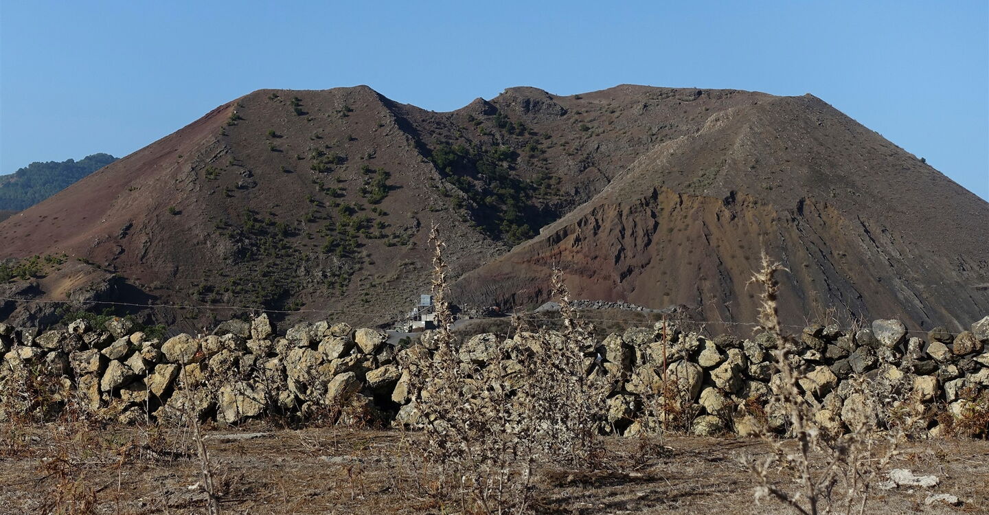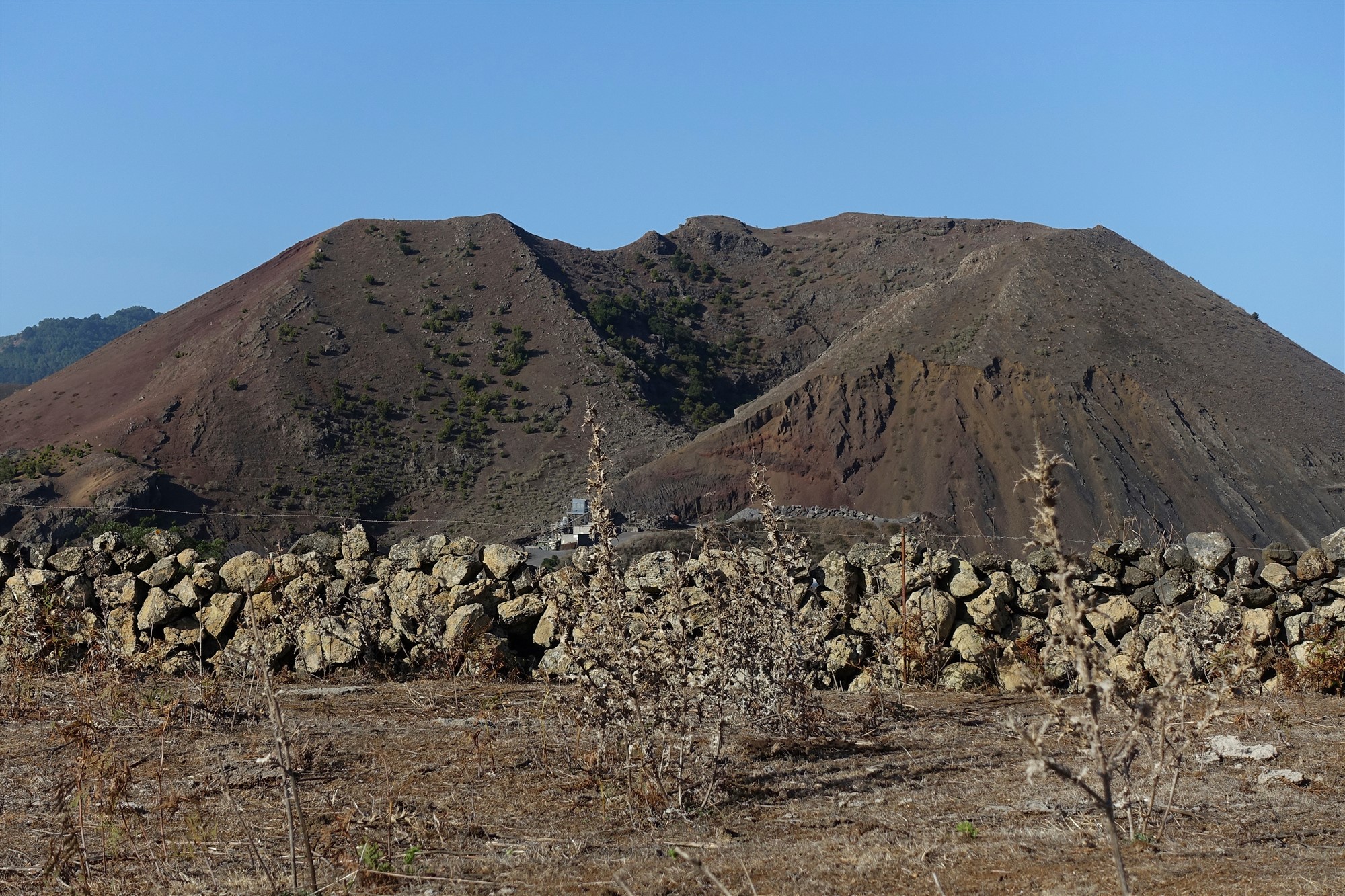 Nachdem wir gut 180° auf dem Kraterrand gelaufen sind, steigen wir bei einer Einbruchstelle des Kraterrands zur tiefer liegenden Piste ab. Es ist kein einfaches Unterfangen, denn auf dem sehr steilen Hang findet man kaum Halt, um abzusteigen. In dem Kapitel Charakter wird eine Variante beschrieben, in der man das Wegstück umlaufen kann. In der Einsattelung zwischen den Vulkankegeln gehen wir bei der Weggabelung halb links an einem kleinen Waldstück vorbei und erreichen eine der ältesten Siedlungen auf El Hierro, (04) La Albarrada (1036 m), die jedoch verlassen ist. Hohe Trockensteinmauern säumen den Weg. Wir gehen bei einer Weggabelung rechts und sofort wieder links und erreichen eine Informationstafel.