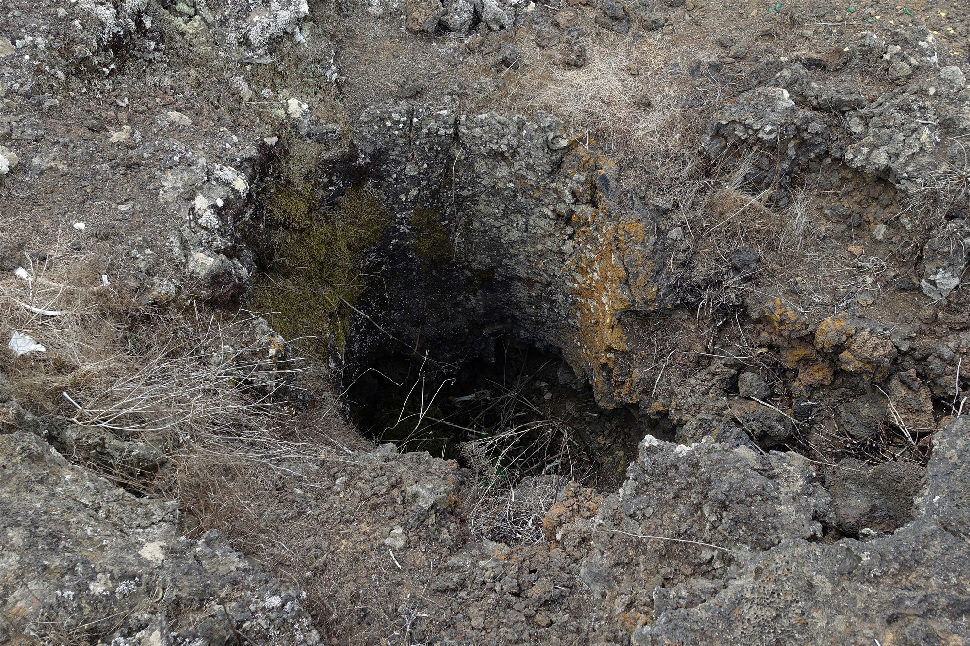 Nach 150 m gehen wir an der Piste links, durch ein Waldstück und bei der folgenden Dreiwegegabelung halb links Richtung San Andres. Nach weiteren 470 m treffen wir auf den Abzweiger, wie er in der Variante beschrieben ist. Die nach weiteren 300 m folgende geologische Sehenswürdigkeit ist nicht einfach zu finden. Vor 2500 Jahren floss Lava um einen Baum und erstarrte, bevor der Baum vollständig verbrannte. Den Baum gibt es schon lange nicht mehr. Was blieb, ist ein 80 cm bis 100 cm großes kreisrundes Loch, beim genaueren Betrachten ist sogar noch der Abdruck der Rinde zu erkennen. Diese sogenannten (05) Vulkanbäume (1050 m) liegen 3-4 m und 10-15 m neben der Piste. Wir setzen unseren Weg auf der weiterführenden Piste fort und nehmen von dort an dieselbe Strecke wie auf dem Hinweg.