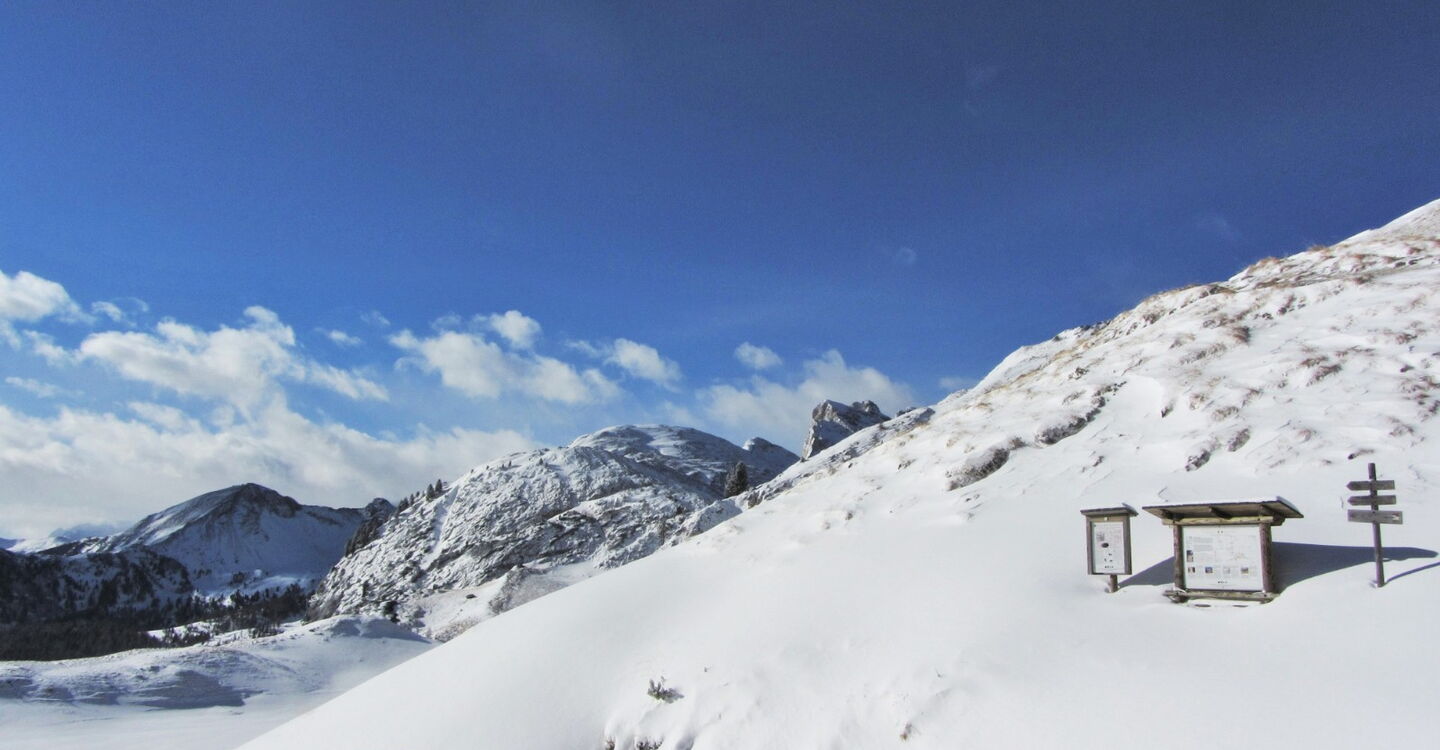 Vor dem Rifugio stehend, gehst du rechts um das Gebäude herum, um dann mit Fellen 1 km und 200 hm bis auf den in westlicher Richtung liegenden Piz Ciampei zu steigen.