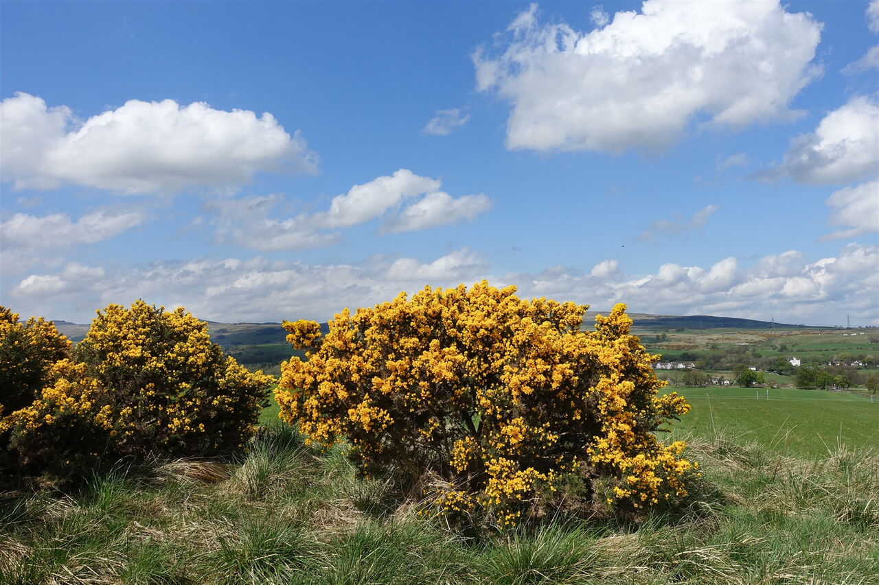 Den nachfolgenden linken Abzweiger ignorieren wir und gehen geradeaus weiter durch das Gatter. Im Frühling führt der Pfad durch farbenprächtige Ginstersträucher, einige Exemplare sind bis zu 2 m hoch. Ihre wohl zufällig gleichförmige Anordnung gleicht schon fast einer 02 Ginster-Allee (2 m), der betörende Duft erfüllt die Landschaft.