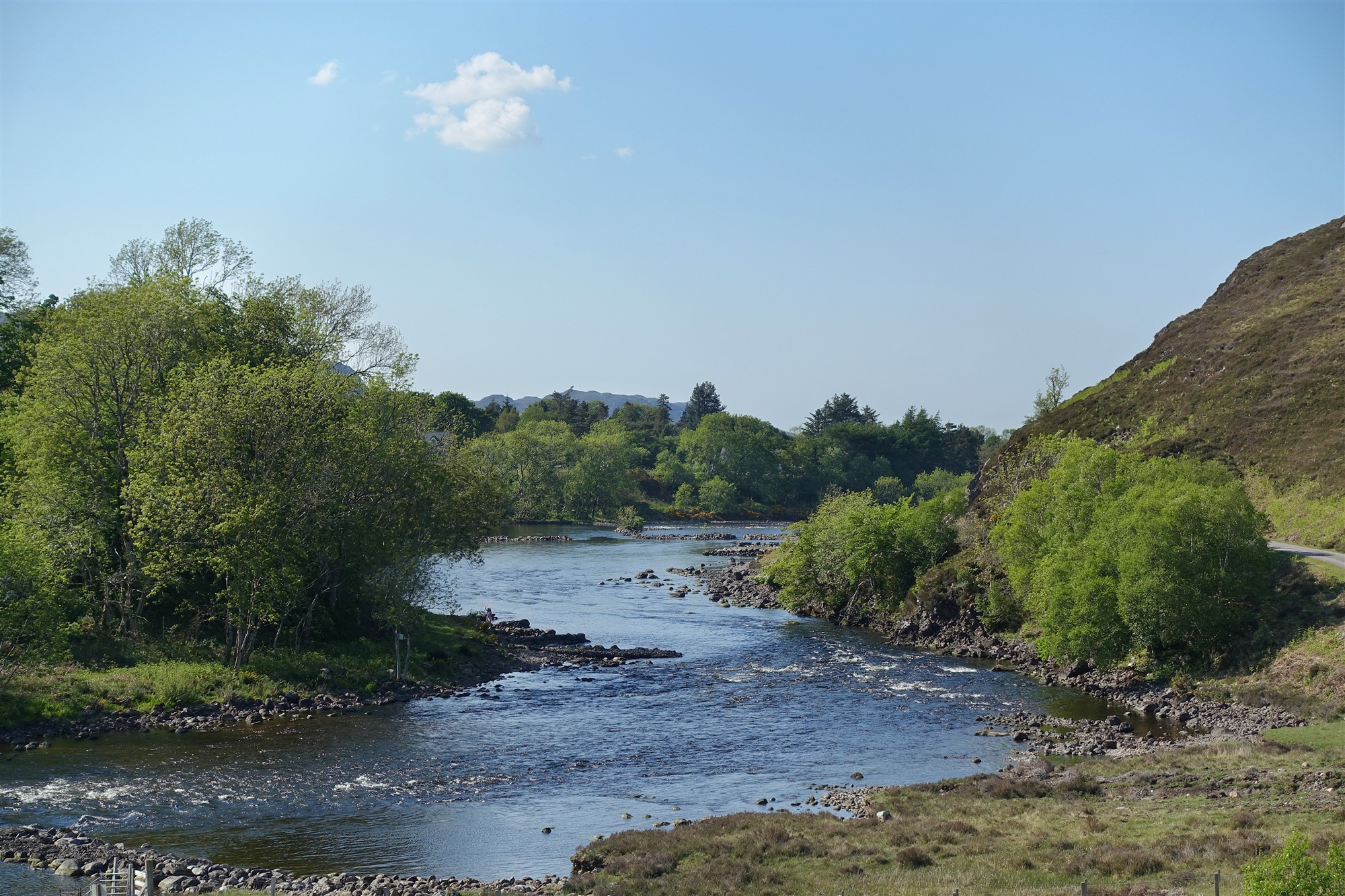 Zunächst führt die Piste am Südende des Loch Kernsary vorbei und dann durch einen schönen Laubwald mit gigantischen farbenfrohen Rhododendren, der sich auf dem Gelände der luxuriösen Inveran Lodge befindet. Hinter einem Warnschild mit der Aufschrift "Blind Corners" führt links ein Weg herunter zum 05 Fluss Ewe (14 m). An dieser Stelle ist er leicht gestaut und lädt an warmen Tagen zu einem erfrischenden Bad ein. Der verbleibende Weg zum Ausgangspunkt führt auf der asphaltierten Privatstraße am zunehmend schneller fließenden Fluss entlang.