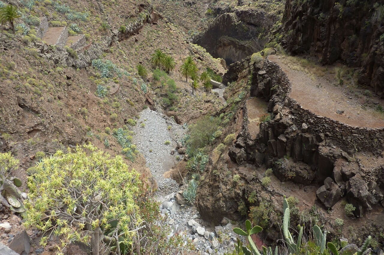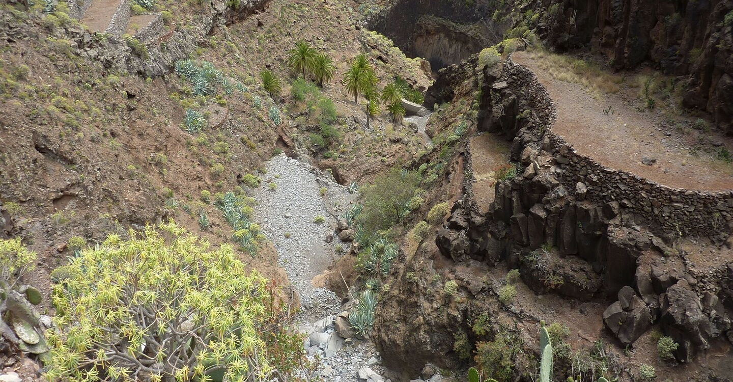 Im sonnigen Süden von La Gomera, westlich vom Flughafen, befindet sich versteckt und unentdeckt das beeindruckende Barranco Erese, das an seinem Schluchtauslauf einen wunderschönen Strand geformt hat. Selbst nach einem trockenen Sommer versiegte das Quellwasser nicht. Diese Besonderheit der Natur hatten sich Bauern zunutze gemacht und im oberen Teil der Schlucht in beeindruckender Lage Terrassenfelder angelegt. Heutzutage ist die gesamte Besiedlung verlassen und dem Verfall preisgegeben. Es folgt eine spektakuläre Wanderung im Barranco, bis wir auf einen alten Verbindungsweg durch die Schlucht treffen. Hier kann man links bergauf den schwierigen Abstieg wählen oder rechts bergauf eine gemütliche Variante.