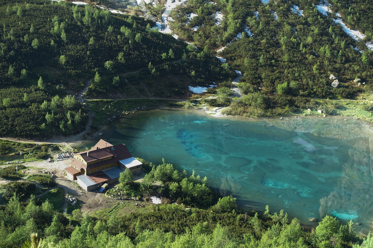 Über den Berggrat steigen wir bis zur Einsattelung ab, im Tal sieht man bereits die Chata pri Zelenom plese, direkt neben dem gleichnamigen See gelegen. Vor uns liegt ein steiler und gerölliger Abstieg. Ein Bachbett wird gequert, Sicherungsketten leiten den Wanderer durch eine rutschige Rinne. Ein weiteres Mal wird das Bachbett gequert und wir laufen nun taleinwärts bis zur 03 Chata pri Zelenom plese (1548 m).