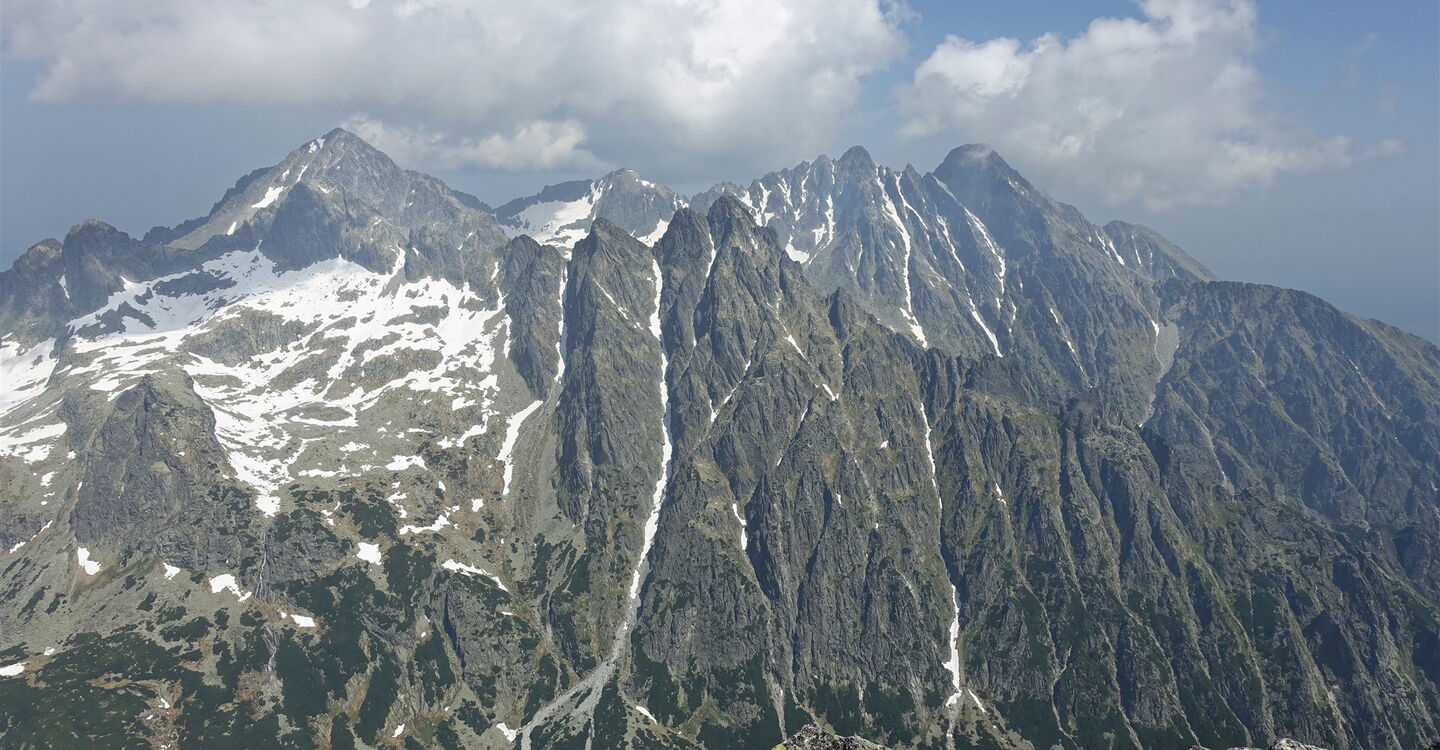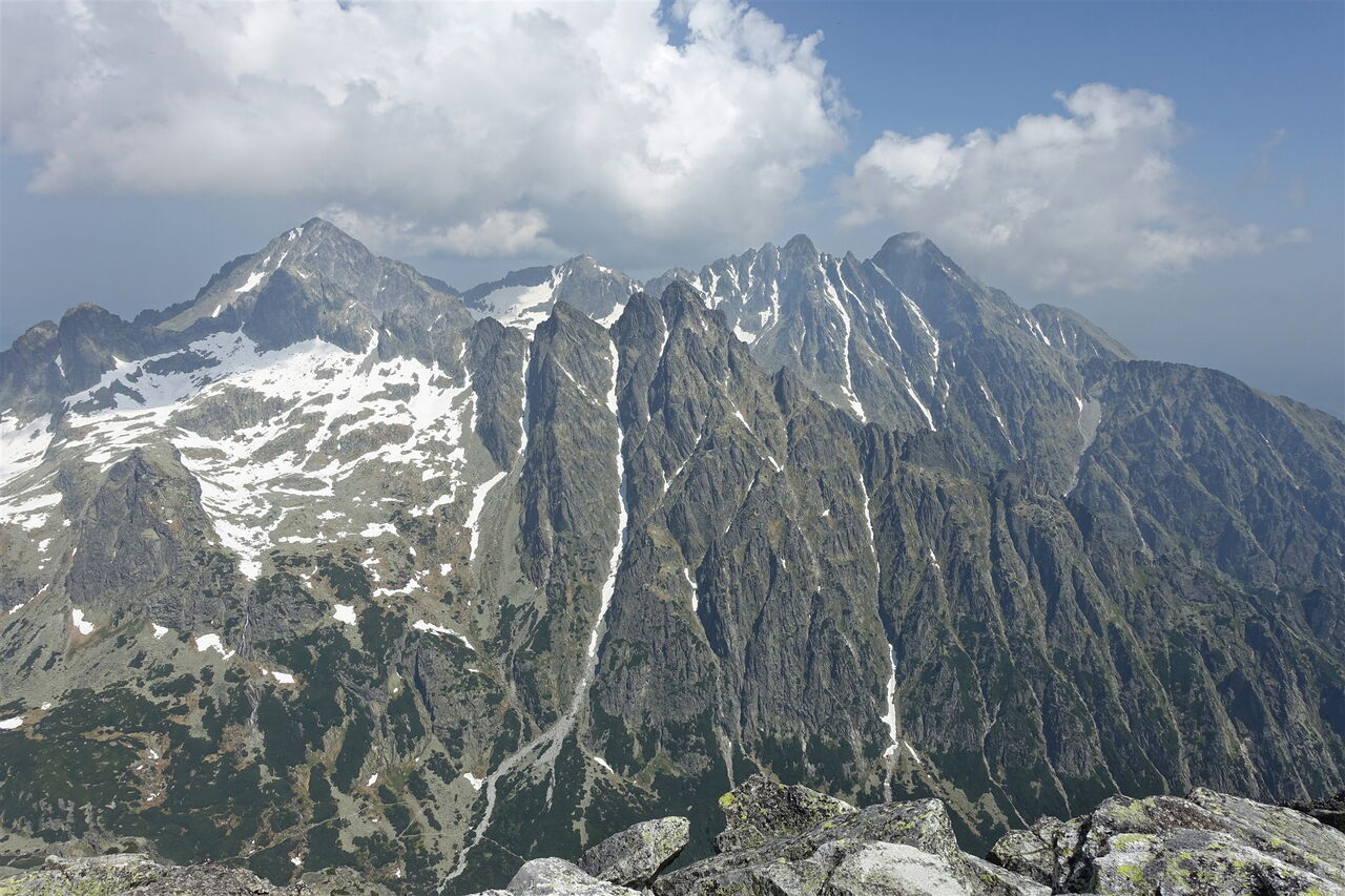 In Serpentinen durch Latschenkiefern erreichen wir einen Berggrat, der sich nun kontinuierlich in Richtung des Vorgipfels 04 Slavkovský nos (2273 m) schlängelt. Weiterhin bietet sich ein faszinierender Blick auf die Bergwelt nördlich von uns. Glück dem, der schönes Wetter hat!