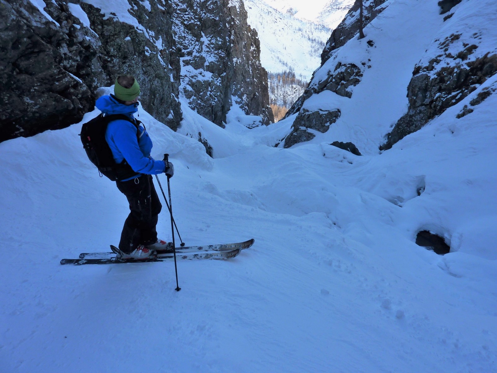 Der Einstieg in die Scharte und auch in den Canyon erfordert eine gute Orientierung, am besten mithilfe des GPS-Tracks. Die Abfahrt führt über einen Westhang. Folgende Ausrüstung wird empfohlen: Produkte für alpine Sicherheit im Schnee, Freerideski und Skitourenhelm. Es gibt verschiedene Restaurants zur Einkehr im Skigebiet. Beste Jahreszeit: Januar bis April. Uns erwarten kurze Stücke mit bis zu 40° Hangneigung.