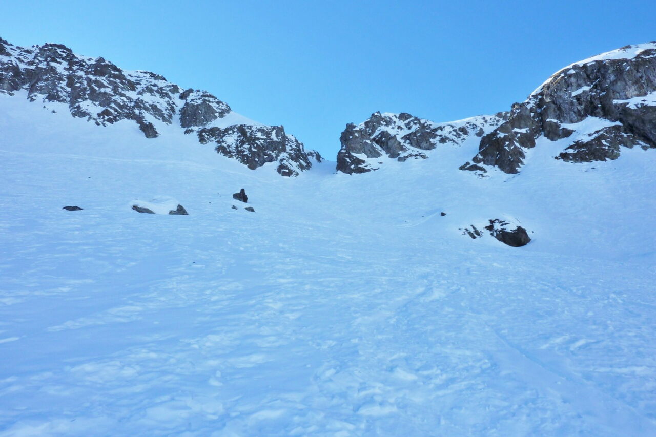 Je nach Schneeverhältnissen sehen wir einen Felsen, an dem wir links vorbeifahren, um nach 900 m hinter dem Lift zur Einfahrt in die Scharte zu kommen. Die Scharte ist 10 bis 15 m breit.