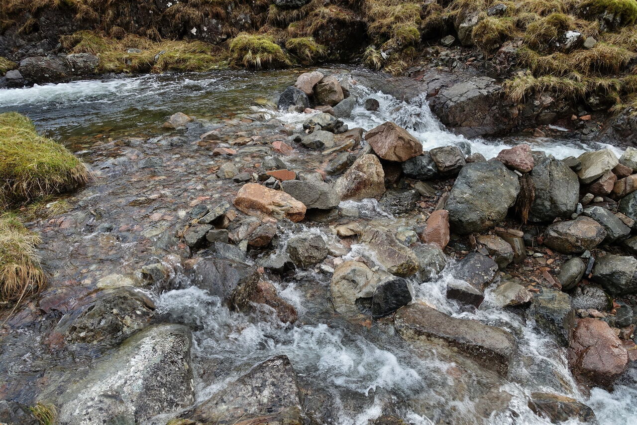 Wir erreichen die 04 Einsattelung (753 m) zwischen Stob Dubh und Stob Coire Raineach. Noch 20 m vor einem Haufen mit rotem Gestein befindet sich auf der rechten Seite der Einsattelung der Abstieg. Nach Regenfällen ist der Pfad gleichzeitig Bach und daher sehr matschig und auch schwer auszumachen. Als gedachte Wegmarkierung kann man links eines Bachlaufes gehen, der im Weiteren zum Bachlauf wird. Bald ist parallel zu diesem ein Pfad zu erkennen.