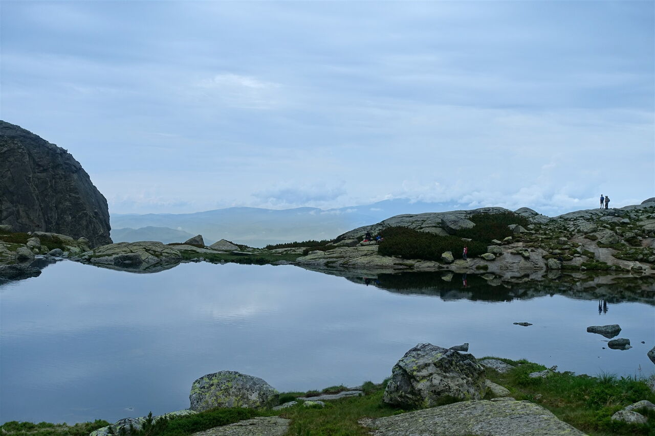 Nach einem rutschigen Aufstieg über die Felsen – an einigen Stellen ist der Pfad mit Ketten gesichert – erreichen wir dann den 160 × 80 m großen See 05 Pleso nad Skokom (1801 m). Schaut man Richtung Süden, so spiegelt sich im See die Bergwelt der Niederen Tatra. Schaut man von Südwesten über den See, so sieht man den 2421 m hohen Berg Satan und Richtung Hauptkamm der Hohen Tatra den 2381 m hohen Berg Štrbský štít. Wir gehen auf dem bekannten Hinweg zurück.