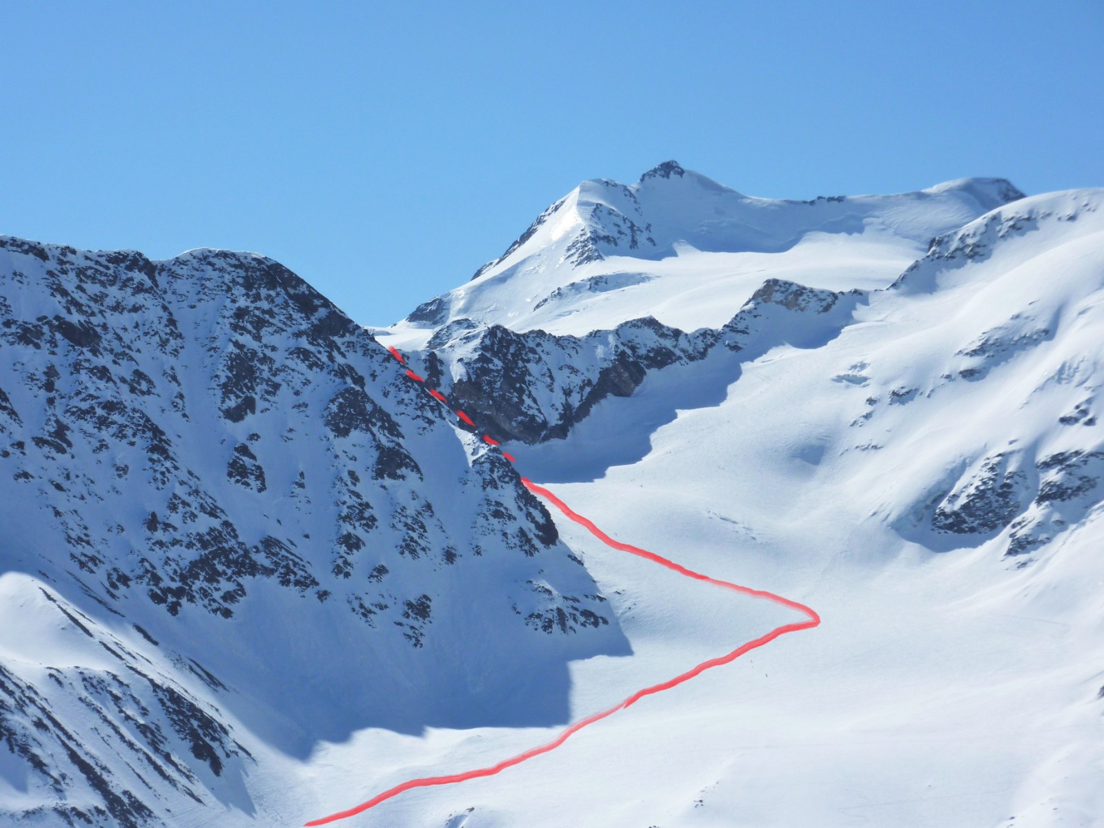 Bei der Bergstation des Lifts B Seilbahn II erreichen wir nach kurzer Abfahrt den Suldenferner. Dort gehen wir ca. 1,5 km bergauf, bis wir uns dann links an den sehr steilen Aufstieg zum Eisseepass machen.