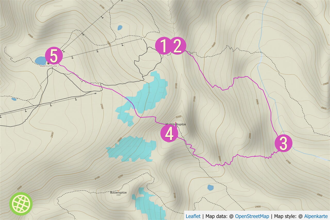 Vor uns liegen 450 hm Abfahrt. Bei Wegpunkt 3 ziehen wir die Felle auf und gehen westlich in Richtung Madritschspitze. Auf unserer Tour kam völlig unerwartet ein sehr starker Sturm auf.