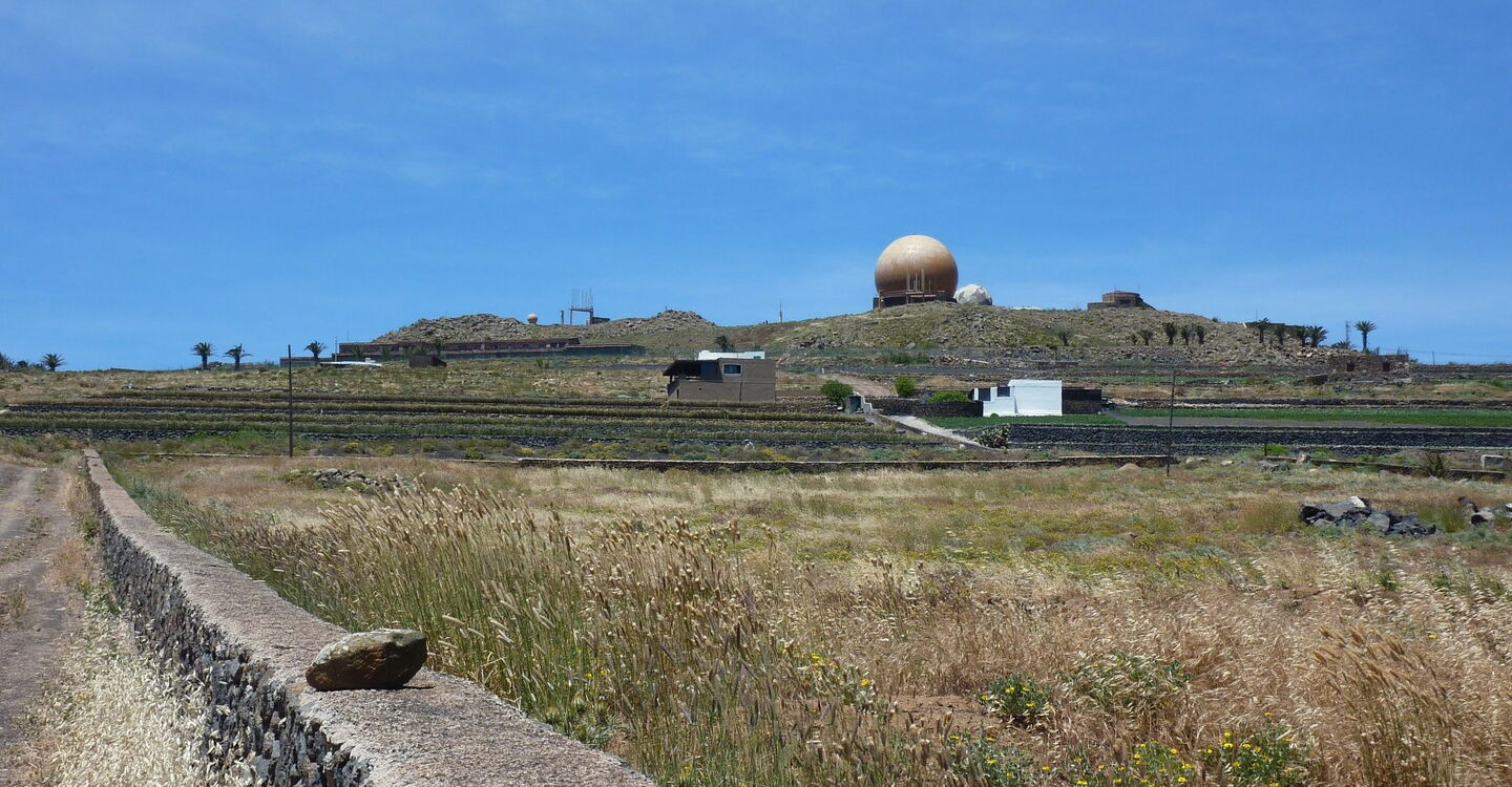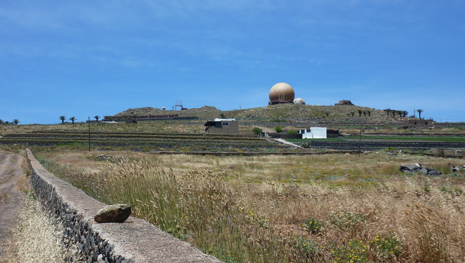 Bei zwei rostigen Pfeilern verlassen wir die (04) LZ-10 (574 m) nach links. Zunächst gehen wir rechts parallel zu einer Grundstücksmauer, um nach 50 m links zu gehen. Auf diesem Schotterweg geht es an Agaven, alten Ruinen und einer Ziegenfarm vorbei. Wir bewegen uns in Richtung drei vereinzelter Palmen, die man schon aus der Ferne sieht. Bei der Weggabelung Pena de la Pequena auf (459 m) gehen wir links Richtung Tabayesco.