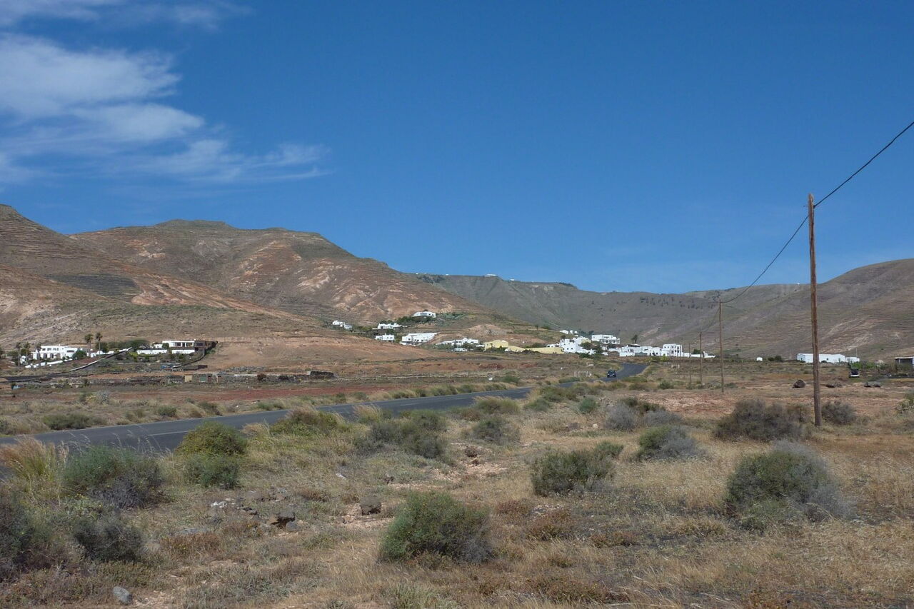 Wir wandern rechts bis zur Kreuzung mit der (03) LZ-10 (363 m). Nach der Überschreitung des Bergkamms befinden wir uns nun oberhalb des Valle de Malpensa. Rechter Hand liegt der Ort Haria - das Tal der 1.000 Palmen. An der Kreuzung halten wir uns links und gehen für 400 m in Richtung Teguise. Kurz nach dem Schild mit der Beschriftung "LZ-10 20 km" führt links der Camino Naturale bergauf. Wir gehen durch einige enge Kehren den Berg hinauf und queren dabei die LZ-10. Tipp: Geht man an dieser Stelle die Straße bis zur nächsten Kehre vor, so kann man von diesem Aussichtspunkt das Valle de Temisa in seiner ganzen Länge überblicken. Auch stehen an dieser Stelle wahre Prachtexemplare von Drachenbäumen. Der Pfad quert abermals die Hauptstraße, bevor es kurz später auf einer Schotterstraße weitergeht. Nach 600 m, immer parallel zur LZ-10, sehen wir rechts am Wegesrand eine Finca, die auf einem braun-weißen Sockel mit schwarzen, aufgesetzten Lavasteinen steht. Hier gehen wir links zur Asphaltstraße, um dann der Hauptstraße rechts für 950 m zu folgen, bis wir in 100 m Entfernung ein dunkelbraunes Haus sehen.