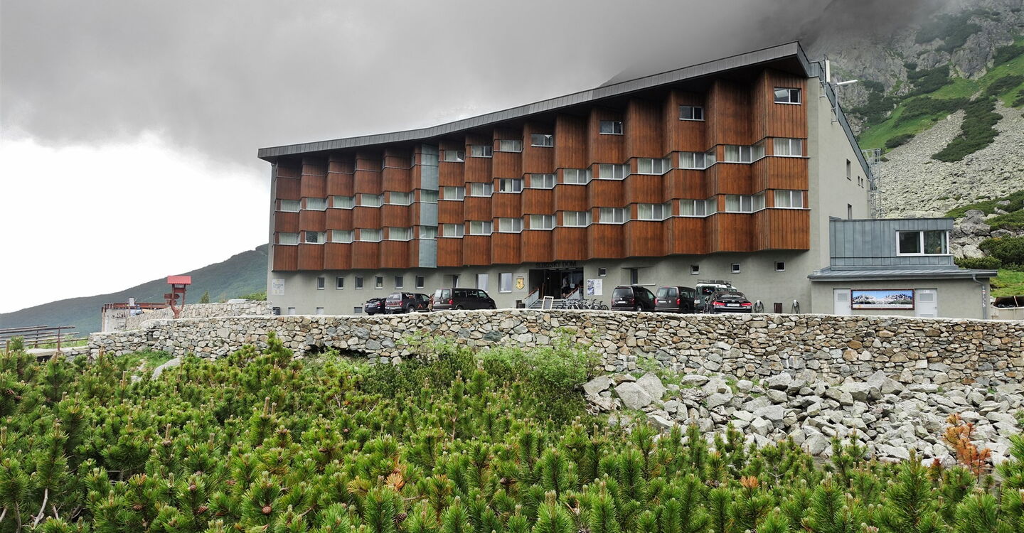 Das ursprüngliche Tal verengt sich und wir kommen oberhalb eines weiteren Sees vorbei. Sattgrüne Wiesen und Felsen mit Gletscherschliff prägen die Landschaft auf dem nachfolgenden Abstieg. Hinter einem großen Wasserfall und einem weiteren See befindet sich auf der rechten Seite der 04 Sliezsky dom (1623 m), die erste Einkehrmöglichkeit. An der Weggabelung orientieren wir uns in südöstlicher Richtung und gehen auf dem grün markierten Pfad weiter bergab Richtung Tatranská Polianka.