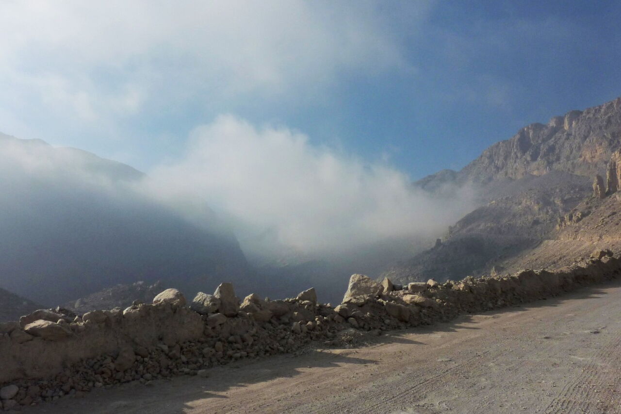 Die Schotterpiste beginnt am Ortsausgang von Khasab. Bereits nach 15 km biegen wir rechts ins Wadi, und es geht in steilen Serpentinen bergauf in eine Welt aus bizarren Felsformationen.