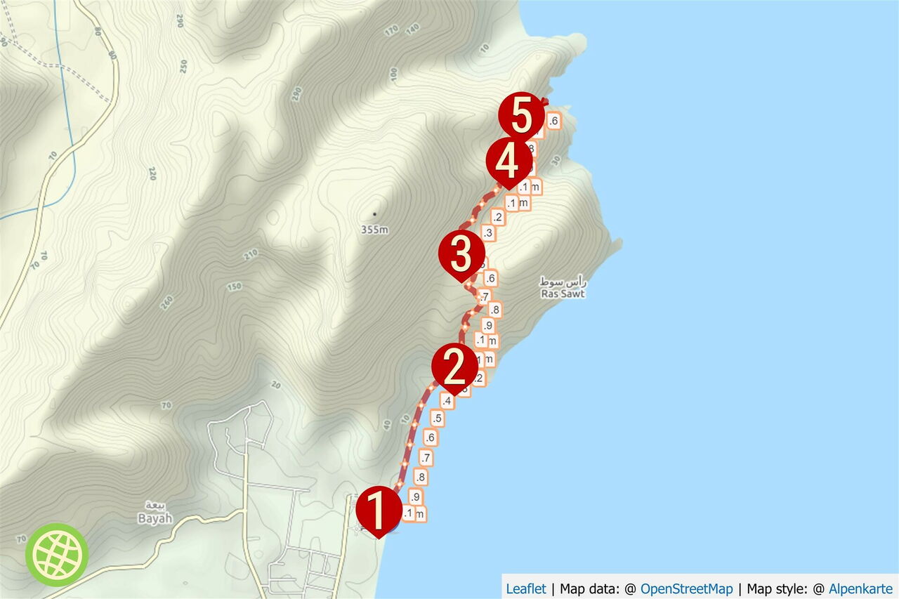 Die Garmin-Navigationsgeräte erlauben die Eingabe der GPS-Koordinaten N25 40.189 E56 16.272. Sie führen dich zum Startpunkt, von wo du den heruntergeladenen GPS-Track verwendest.