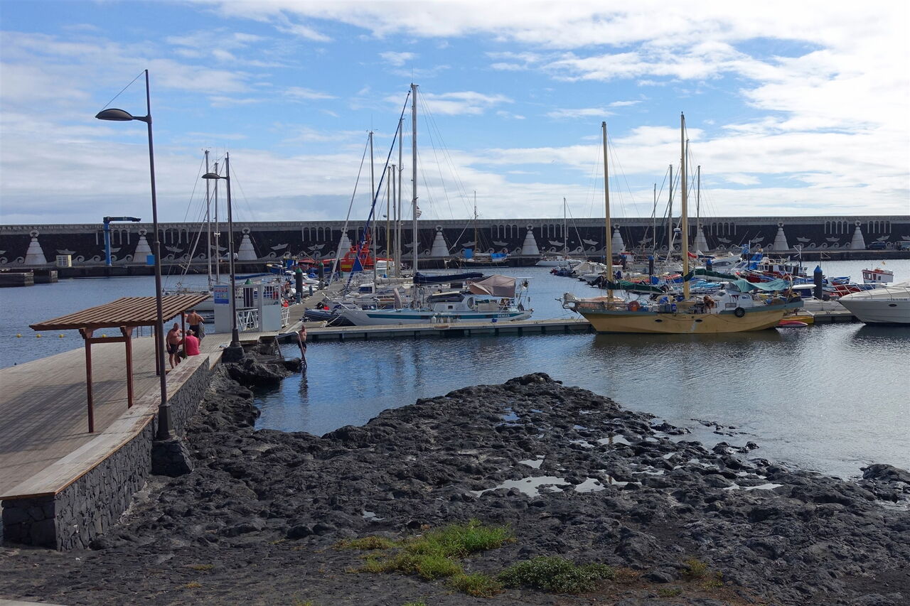 Nach 425 m queren und nach 60 m tangieren wir die Hauptstraße Richtung La Restinga. Nach weiteren 250 m setzen wir den Abstieg auf dem Camino (02) halb links (678 m) fort. Der gemütliche Abstieg führt durch ein Weinanbaugebiet, bis der Weg in eine Schotterpiste übergeht. Wir passieren den rechts von uns liegenden Vulkan, danach öffnet sich ein weiter Blick bis zur Hafenanlage von La Restinga.