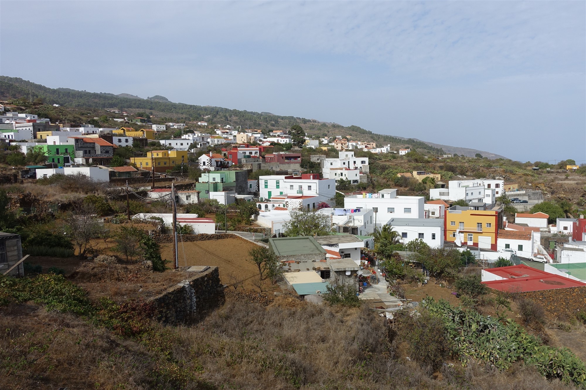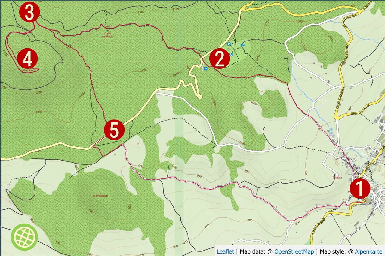 Vom (01) Start und Ziel (823 m) am Busbahnhof wandern wir auf der Anfahrtsstraße zurück, um direkt vor dem Dorfplatz in die Einbahnstraße Calle El Chamorro zu biegen. Bei einem Heiligenschrein gabelt sich die Straße und wir gehen halb rechts bergauf. Bei der nachfolgenden großen Kreuzung gehen wir halb links am Barranco entlang. An der nachfolgenden Kreuzung gehen wir weiterhin geradeaus auf dem Camino El Pinar. Wir erreichen eine Weggabelung, halb rechts geht es zur Aula de la Naturaleza. Wir gehen halb links in den Pinienwald und folgen den aus Lavastein gemauerten Markierungen. Bei der darauffolgenden Weggabelung folgen wir weiterhin dem Camino El Pinar. Einen mit Steinen gesäumten Pfad nach rechts ignorieren wir.