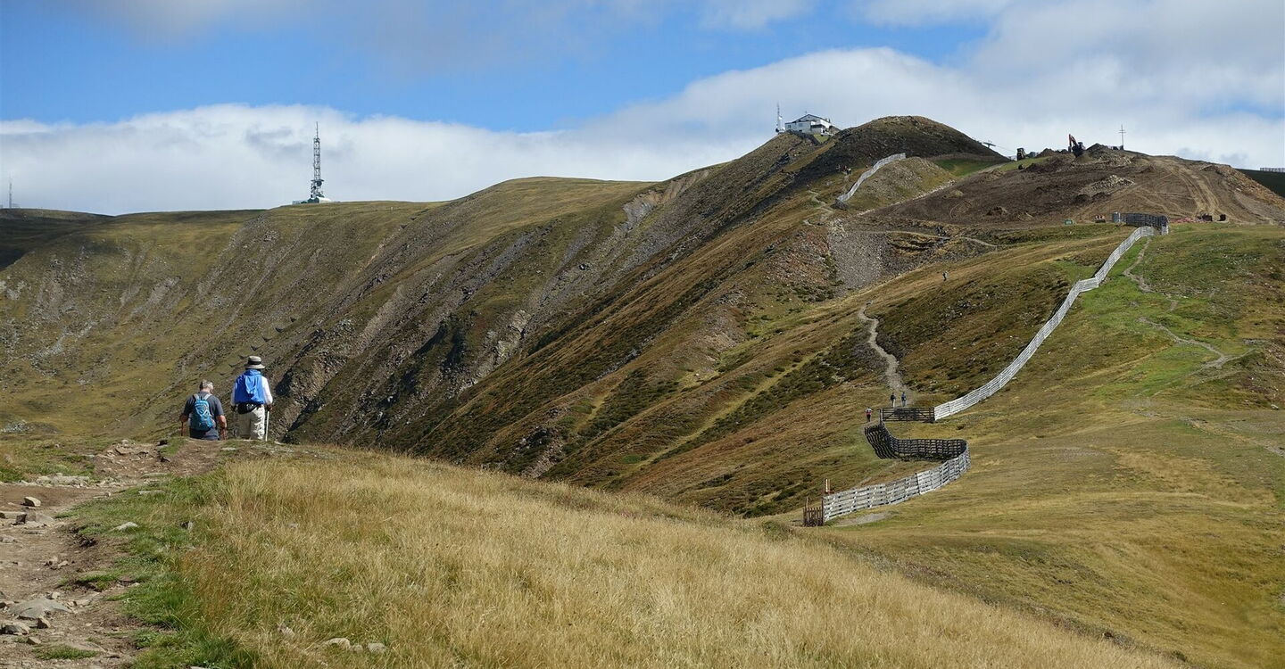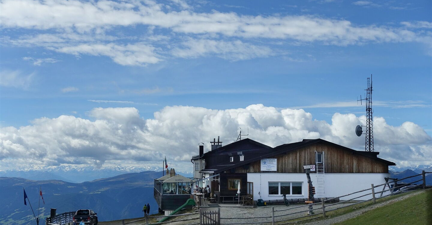 Hinter dem Gebäude der 02 Bergstation der Plose-Kabinenbahn (2.050 m) gehen wir gleich scharf links und dann ein kurzes Stück entlang des Brixner Höhenweges – der Wanderweg 7, auch ausgeschildert Richtung Plose.
