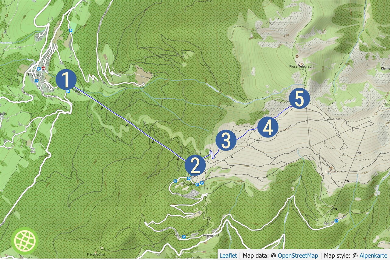 Der klassische Dolomitenhöhenweg Nr. 2 beginnt bei der 01 Talstation der Plose-Kabinenbahn (1.067 m). Entweder man steigt über die Wanderwege 5 und 17 bis zur Bergstation auf oder man wählt die einfachere Variante und fährt mit der Kabinenbahn.