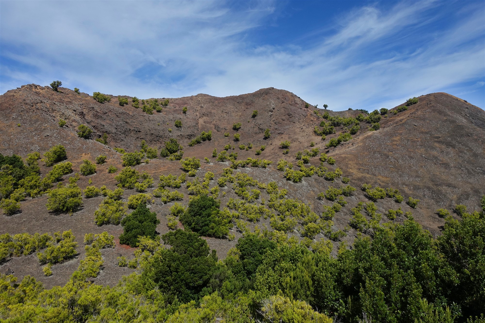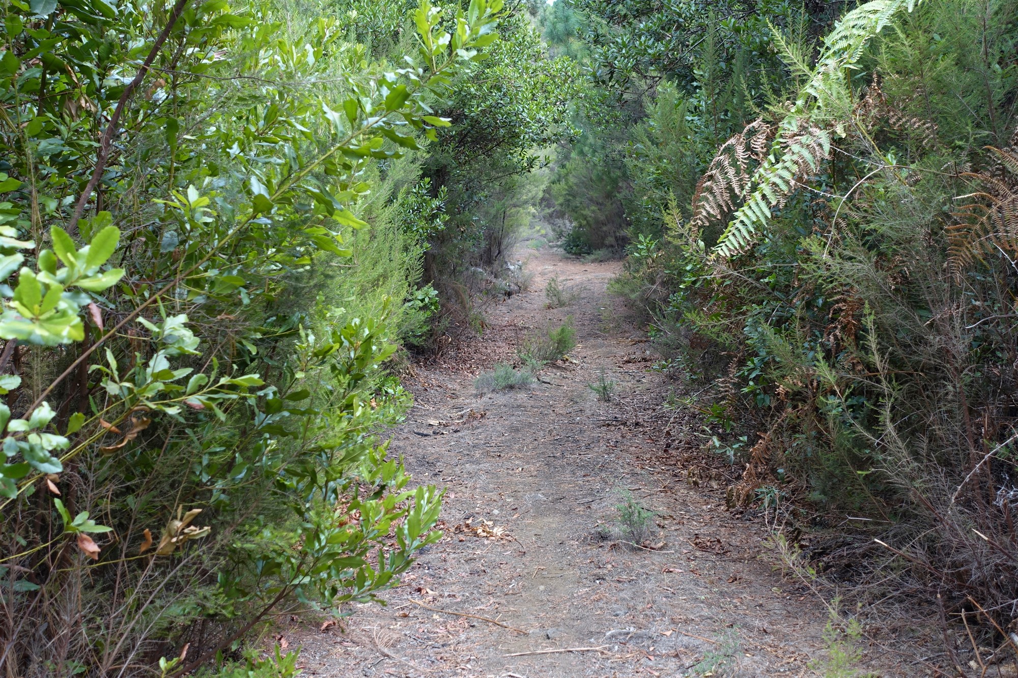 Nach 3,4 km zweigt scharf links der (02) Camino Sabinosa (794 m) ab. Auf laubgefedertem Untergrund geht es in Kehren kontinuierlich bergauf. Auch auf dieser Wanderung gilt: Achtung vor den hüfthohen maulbeerblättrigen Brennnesseln, sie sind nachhaltig schmerzhaft! Wir lassen die Vegetationsstufe des immergrünen Nebelwalds hinter uns und erblicken Kanarische Kiefern am Wegesrand. Der Wanderweg führt über feines Lapilli-Gestein und kurz später über lange, vertrocknete Tannennadeln.