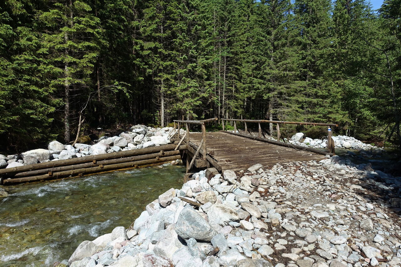 Ein zweites Mal überqueren wir den 04 Biela Voda (1097 m) und gehen weiter und tiefer in das Bielovodská Dolina. Die Forststraße gabelt sich ein erstes Mal, wir gehen geradeaus weiter.