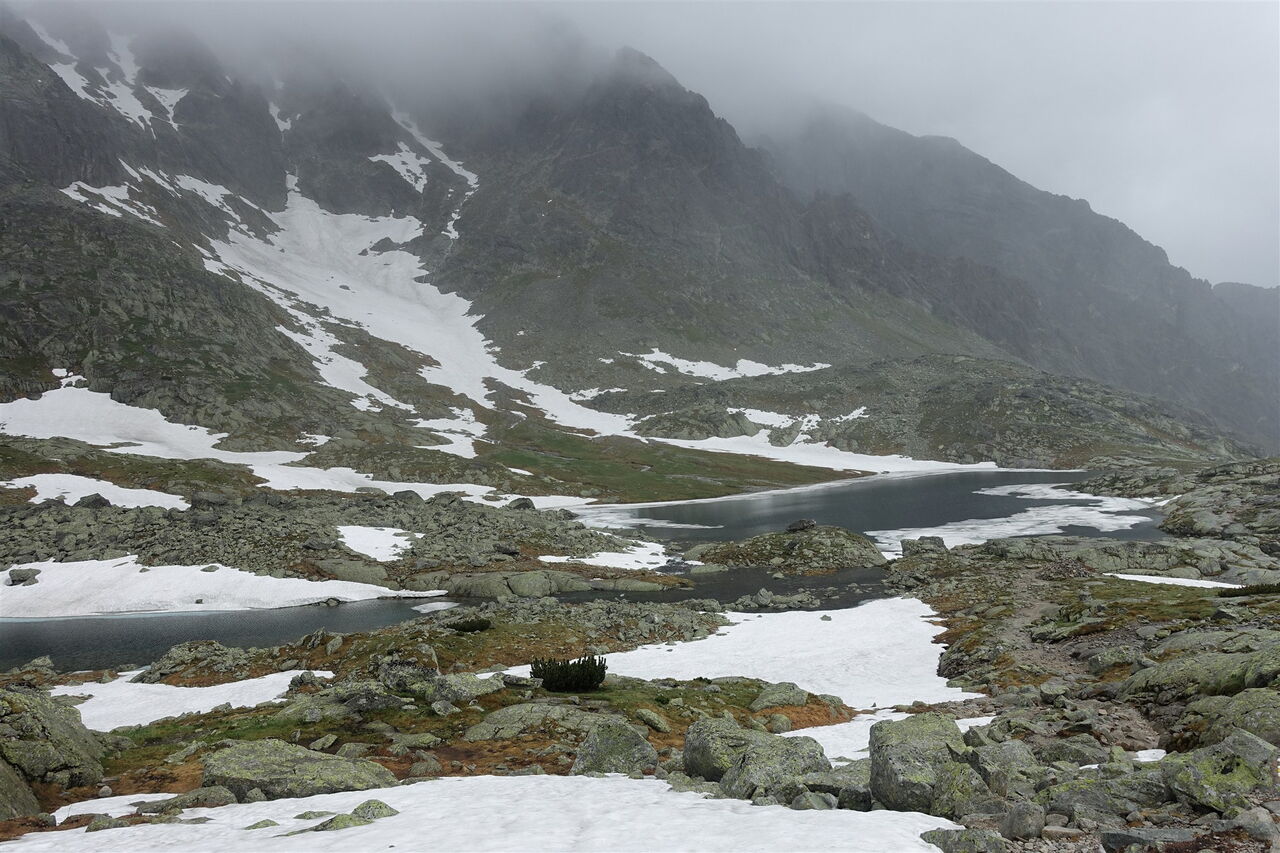 Noch einmal der Hinweis: Aus Naturschutzgründen ist der Wanderweg in der Zeit vom 1. November bis 14. Juni geschlossen. Es drohen deftige Strafen bei Nichteinhaltung! Von der 01 Téryho Chata (2015 m) gehen wir durch das Hochtal mit seinen von Gletschern geschliffenen Felsen, Feucht- und Wasserflächen in westliche Richtung bis zum ersten See der Päť Spišských plies. Über in den Abfluss des türkisgrünen Sees (wenn denn die Sonne scheint) verlegte Steine balancieren wir auf die andere Uferseite und folgen dem weithin sichtbaren Pfad.