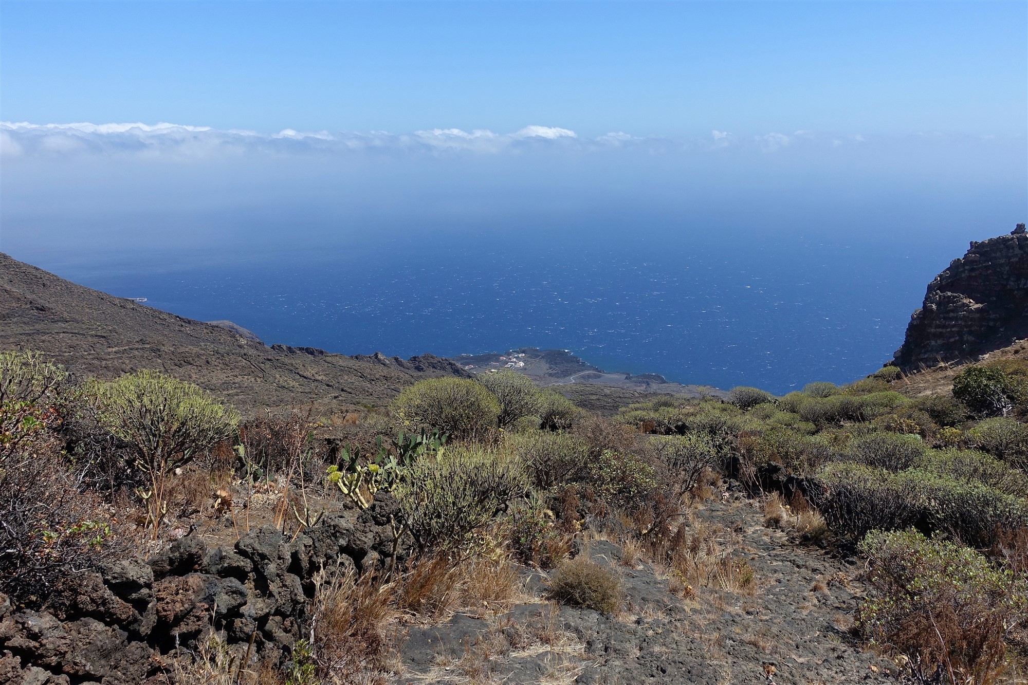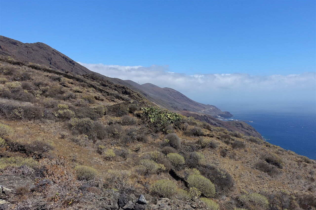 Auf dem Seitenstreifen laufend, folgen wir der Ausschilderung Richtung Timijiraque. Vor dem Tunnel gehen wir auf der alten Straße direkt oberhalb des Meeres entlang, schon bald sehen wir das kleine Dorf Timijiraque mit einem der wenigen Sandstrände auf El Hierro. Die Bushaltstelle von (03) Timijiraque (18 m) befindet sich nach 300 m im Ortskern, wir gehen aber 50 m hinter dem Fischrestaurant, bei dem hellbraunen Gebäude, die Straße rechts bergauf – ein kurzes Stück asphaltiert, kurz später ein Camino. Wir queren einen riesigen Schluchtauslauf und kommen an einem Wassertank vorbei. Es folgt ein gelb-weiß markierter Wanderweg. Auf den nachfolgenden 900 Höhenmetern queren wir sechsmal die Asphaltstraße.