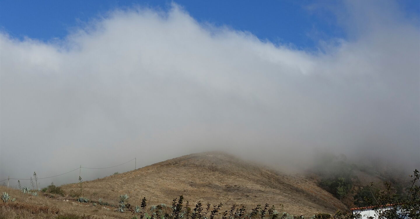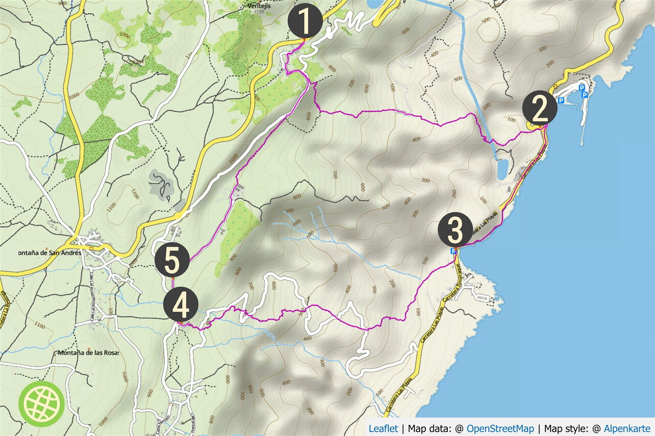 Da der Aufstieg nicht im Einflussbereich der Passatwinde und Passatwolken liegt, kann es um die Mittagszeit extrem heiß werden, auch gibt keine Schatten spendenden Bäume auf dem kräftezehrenden Aufstieg. Hinter einem gelben Haus erreichen wir die betonierte Straße. Wir steigen auf dieser bis zur Verbindungsstraße von San Andres nach Isor auf und überqueren diese. Nach 40 m, hinter einem gelbgrauen Haus mit dunkelbraunen Fensterläden, kann man links abbiegen und so auf eine (04) Variante Richtung San Andres (921 m) gelangen. Das Teilstück ist in der Wanderung 29 unter dem Wegpunkt 05 beschrieben. Wir gehen geradeaus weiter, auch ausgeschildert Richtung Puerto. Nach einem kurzen Stück auf der Hauptstraße verlassen wir diese bereits nach 60 m auf den Abzweiger nach halb rechts.