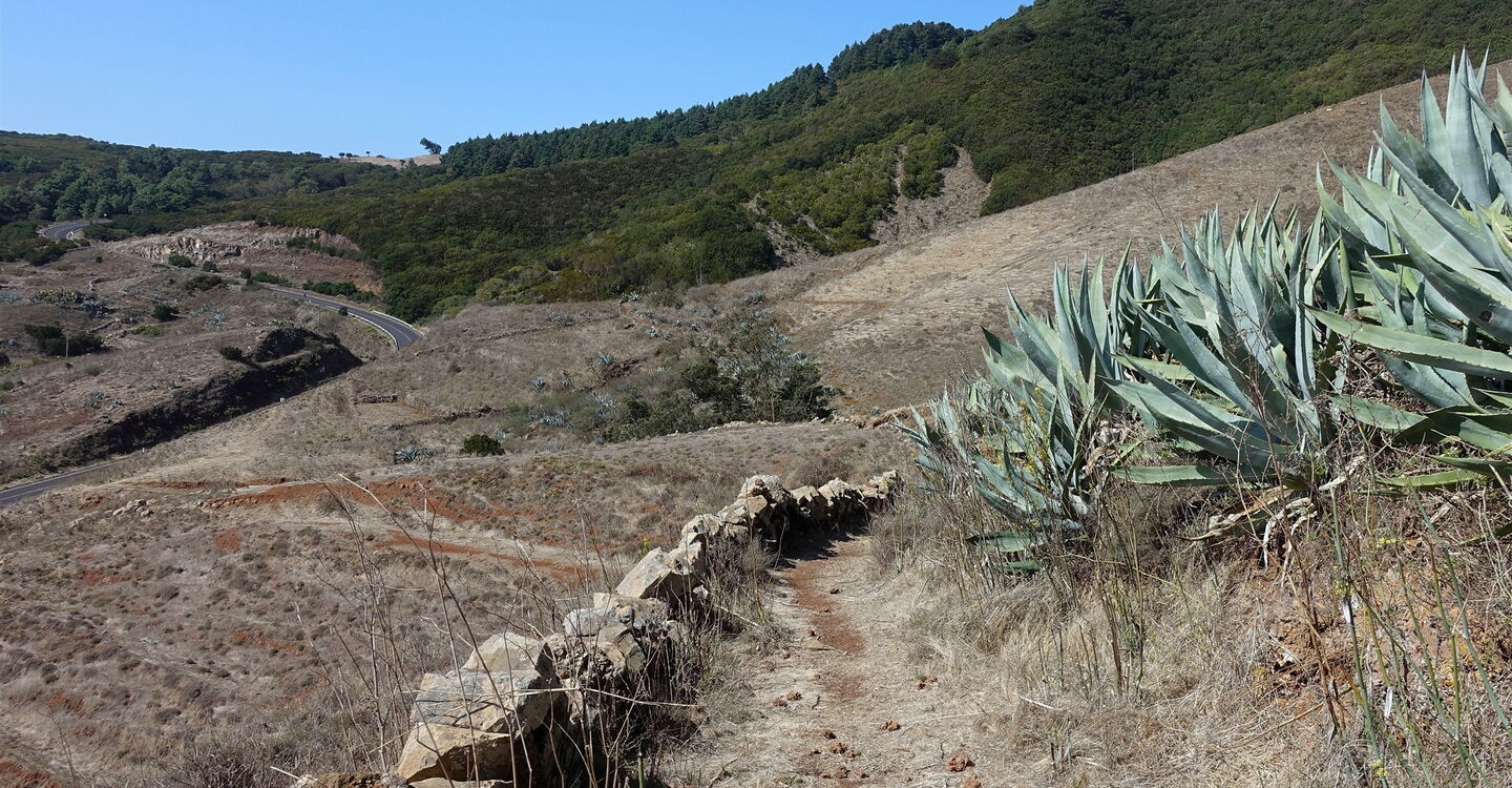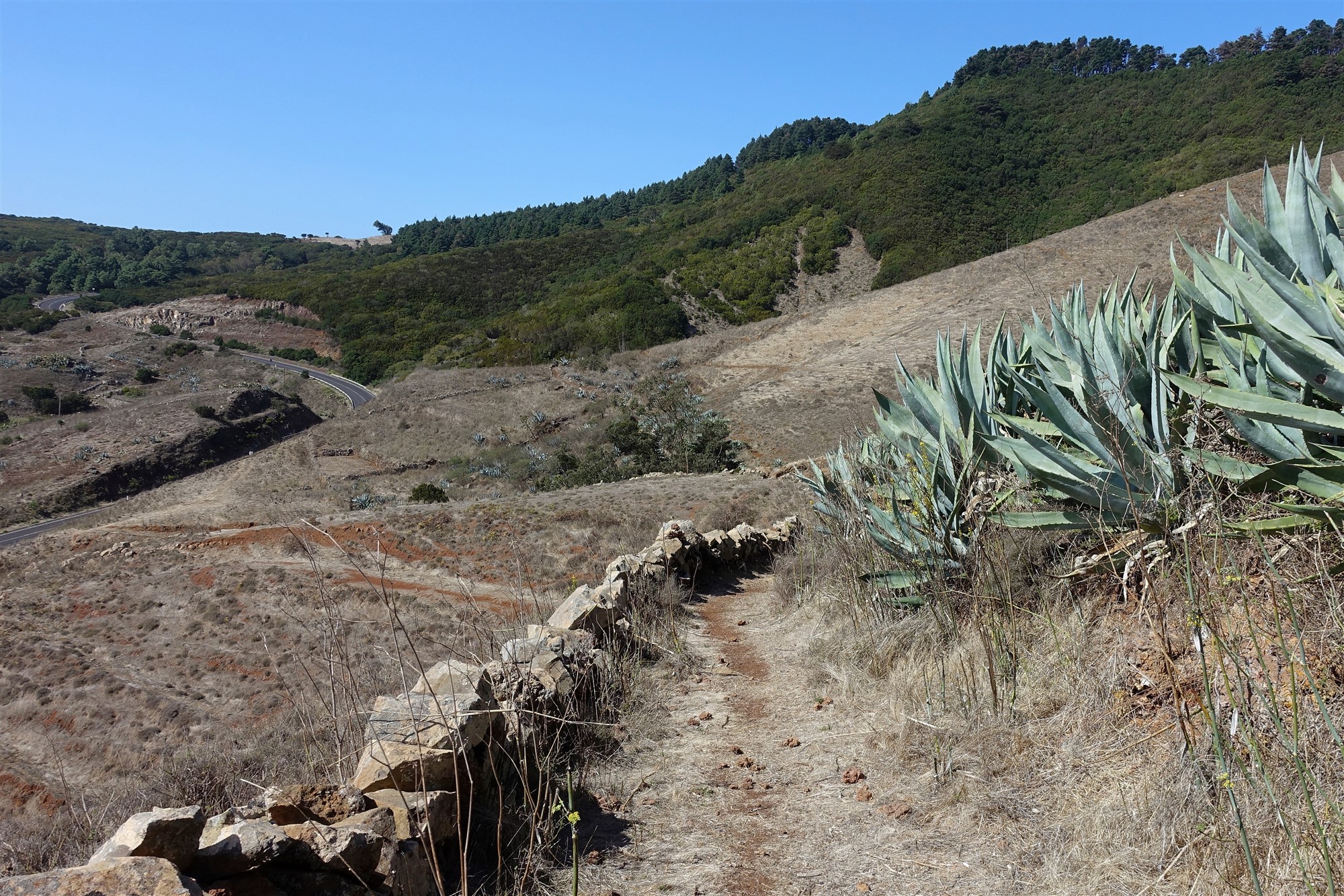 Es folgt ein landschaftlich sehr schönes Wegstück durch einen wohlriechenden Kiefernwald und vorbei an einem künstlich angelegten Wasserreservoir. Der Pfad endet an einer (02) Kreuzung (1047 m), wir gehen geradeaus weiter, auf einem Pfad links entlang einer Mulde. Am Ende der Mulde gehen wir bei der Weggabelung halb rechts, vorbei an Zedernwacholderbäumen. Die Piste wird zu einem mit großen Felsen gesäumten Pfad. Vorbei geht es an einer kleinen Staustufe und durch ein Waldstück, bis wir die Piste erreichen. Nachdem wir 215 m auf dieser bergauf gegangen sind, halten wir uns bei der darauffolgenden Weggabelung halb rechts und ignorieren den linken Abzweiger zum Heiligen Baum Arbol Garoe.