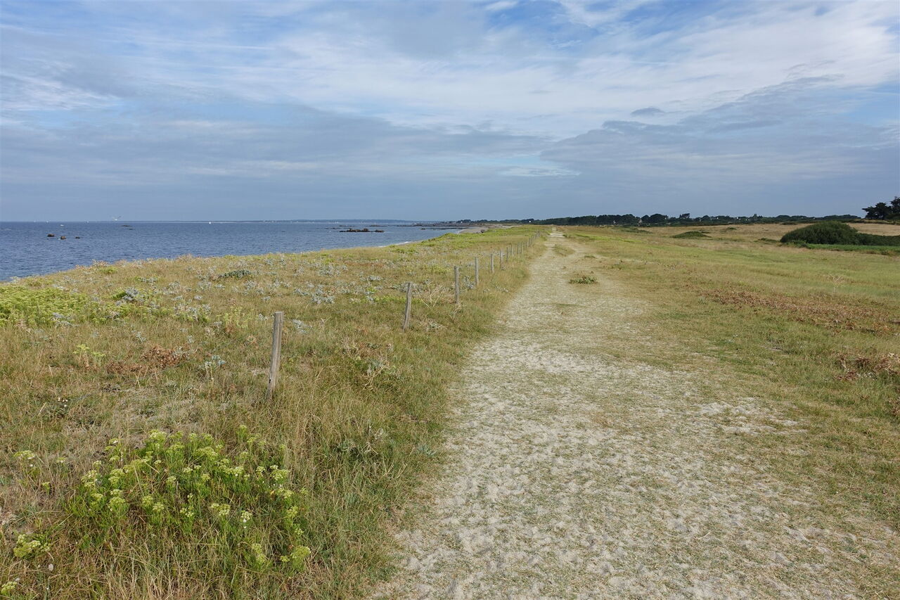 Vom Parkplatz aus gehen wir um die Landspitze 01 Pointe Trévignon (7 m) herum. Wir kommen an dem Leuchthaus und kleinen Fischereihafen vorbei und gehen noch ein kurzes Stück auf der Straße weiter, um dann halb links auf den Küstenpfad abzuzweigen. Bei dem darauffolgenden Parkplatz gehen wir scharf links und bei der anschließenden Gabelung rechts. Wir haben nun die Wahl, entweder direkt am Strand zu gehen oder auf einem schmalen Trampelpfad durch die Dünen, der direkt neben einem Zaun verläuft. Den ersten rechten Abzweiger ignorieren wir noch, aber hinter dem letzten Bunker gehen wir dann rechts und auf der Dünenkrone wieder links.