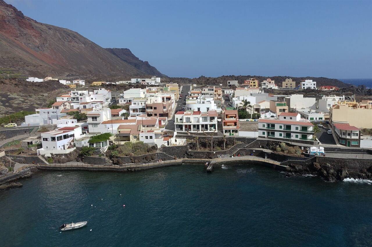 Mit Blick auf das imposante Postgebäude in (01) Valverde (589 m) gehen wir nach rechts und am Gebäude entlang, um bei dem grünen Treppengeländer die Stufen bis zur Straße herunterzugehen. Wir kommen an der kleinen Käsekuchenbäckerei vorbei, queren die nachfolgende Kreuzung und gehen nach 30 m bei der Weggabelung halb rechts – auch ausgeschildert Richtung La Caleta. Auf der Straße zum Flughafen und zum Hafen angekommen, gehen wir 100 m rechts, um dort bei dem Zedernwacholderbaum links auf eine Piste zu gelangen. Diese verlassen wir sofort wieder nach links, bevor die Piste wieder zur Straße hochführt. Vorbei geht es an einem Wassertank und entlang einer oberirdisch verlegten Wasserleitung. Wir überqueren eine weitere, etwas dickere Wasserleitung und gehen hier geradeaus weiter.