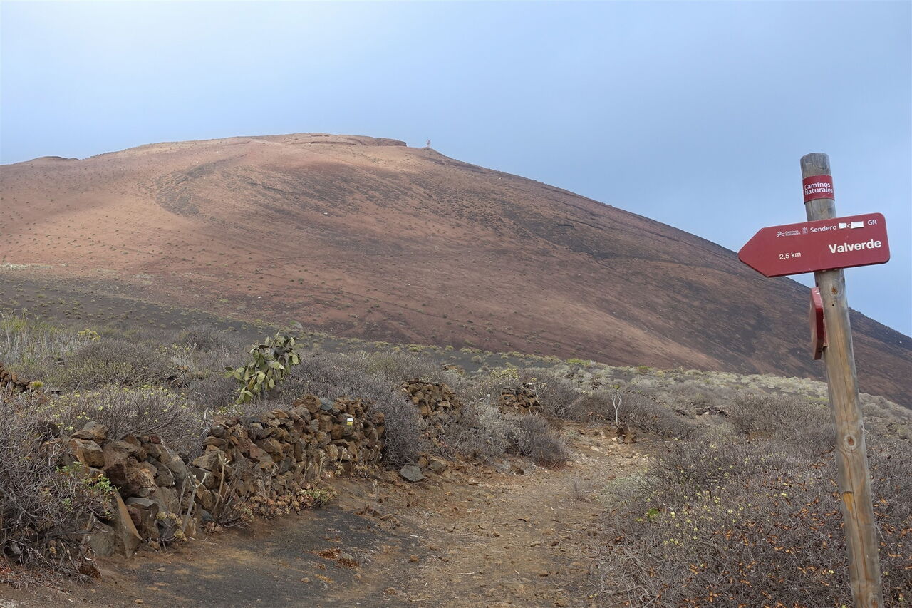 Bei einem Lavasteinhaus befinden sich viele Wegweiser. Wir ignorieren den Abzweiger Richtung (05) Echedo (223 m) und gehen links Richtung Valverde. Der Pfad auf schwarzen Lapilli mündet in eine geteerte Straße, der wir weiter bergauf folgen, bis sich nach 360 m ein großer Felsen am Wegesrand befindet. Hier gehen wir nur einige Meter rechts in die Hauszufahrt und dann links auf dem sehr steil ansteigenden Pfad. Auf der nachfolgenden Straße erreichen wir hinter einer Anhöhe ein großes Gebäude, überqueren die Straße nach halb rechts und gehen links in die gepflasterte Straße. Nach 75 m überqueren wir den Zebrastreifen und gehen in die Einbahnstraße, bis wir bei einem Stoppschild auf den Hinweg gelangen. Wir gehen das restliche Stück des Rückwegs auf dem bekannten Hinweg.