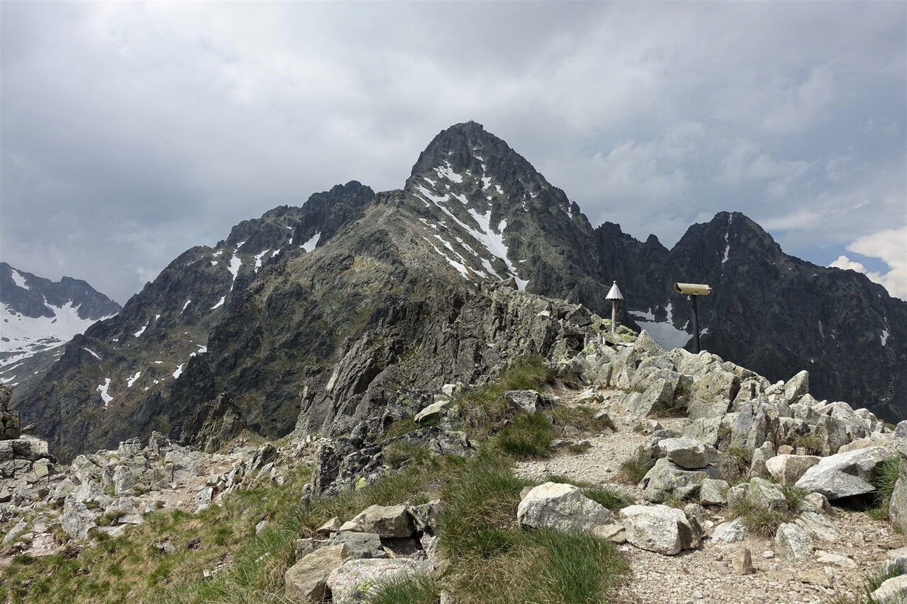 Über den nun sehr breiten und perfekt mit Felsen angelegten Pfad erreichen wir den Aussichtspunkt 05 Vyhliadka Lomnická veža (2214 m). In nordwestliche Richtung sieht man die Bergwelt wie bereits vom Lomnické sedlo aus, Richtung Norden erhebt sich der Lomnický štít, Richtung Süden das Vorland der Hohen Tatra mit dem Zipser Becken und dahinter die Niedere Tatra. Wir gehen auf dem bekannten Hinweg zurück.